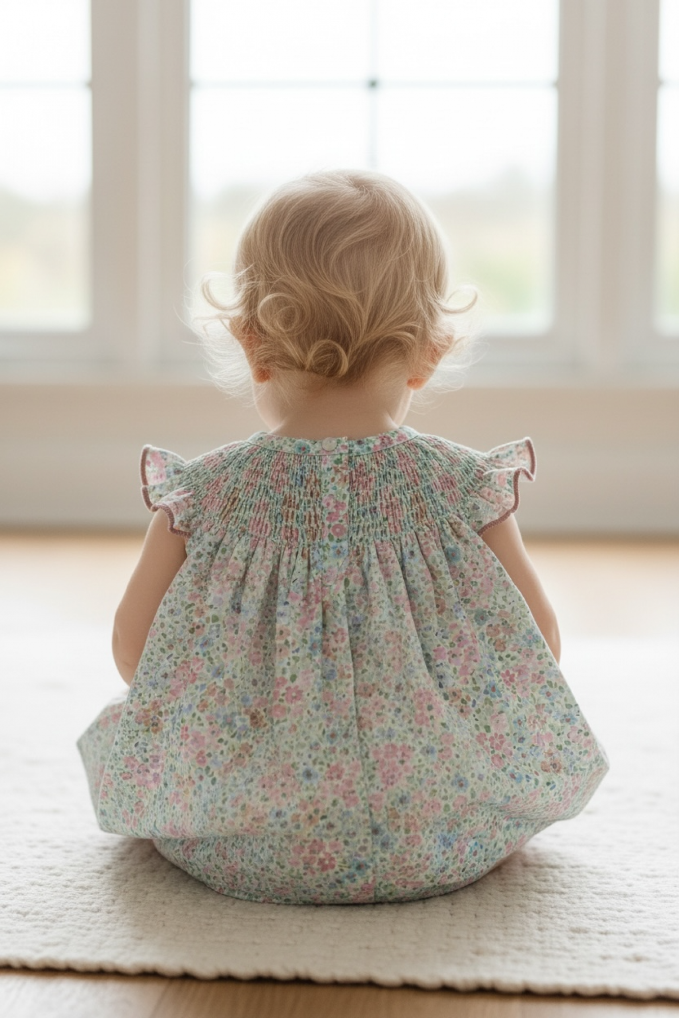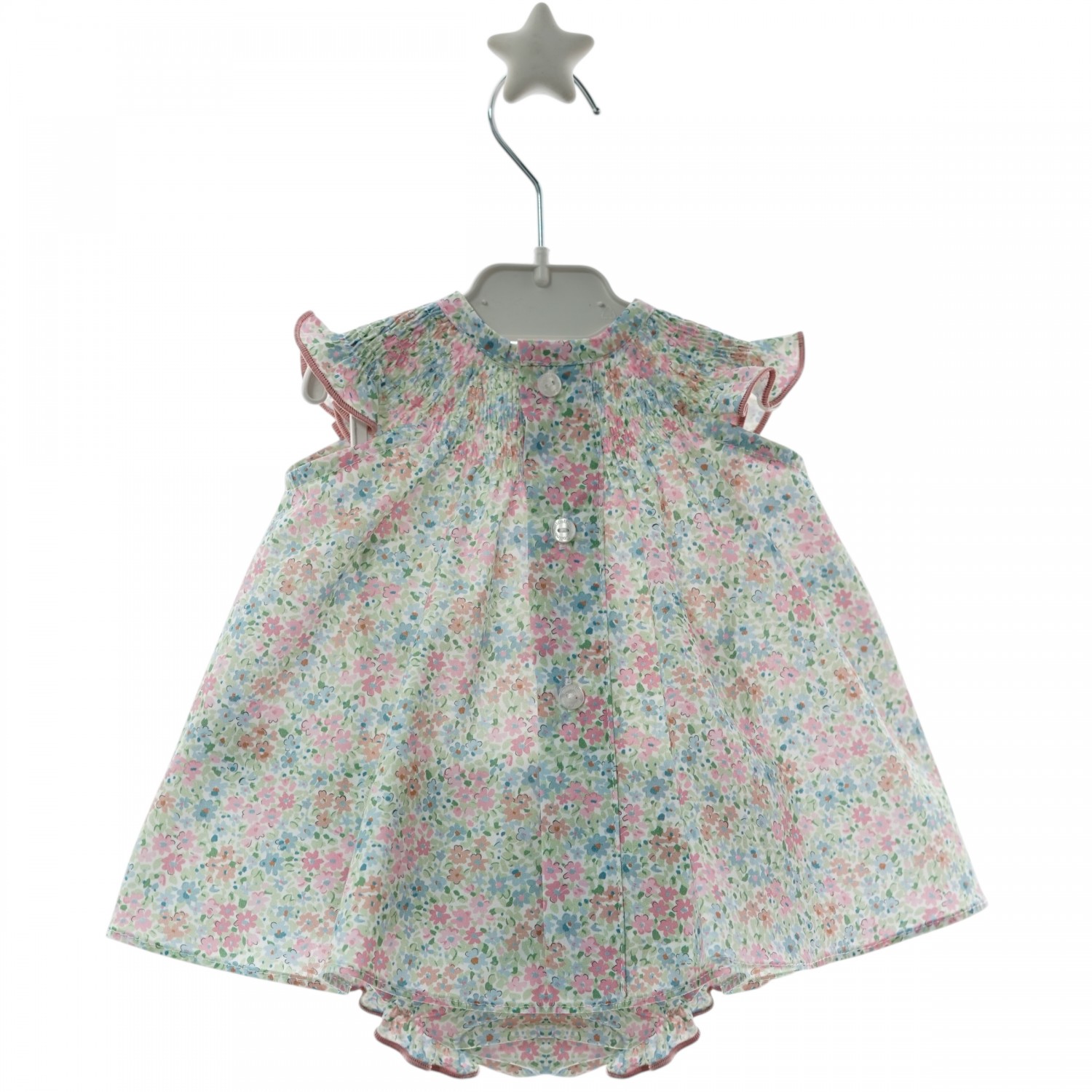 Adorable for everyday wear or special occasions, cool and very comfortable. Features a smocked yoke, round neck, and ruffled sleeves.