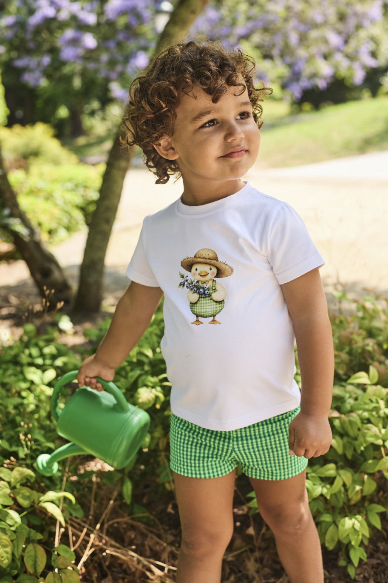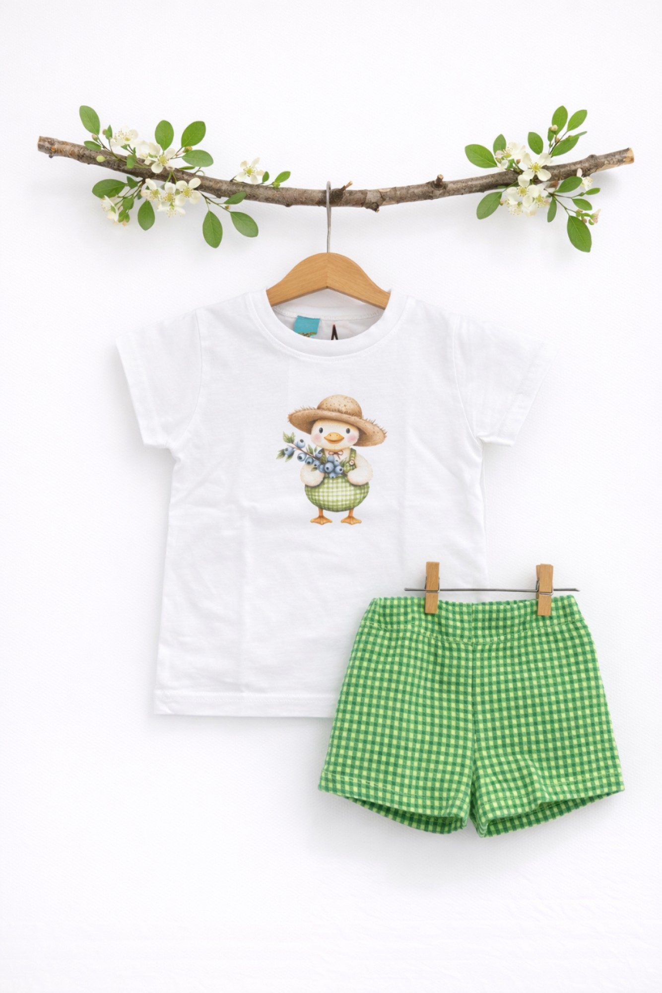 The T-shirt is plain white with a cute illustration of a duckling wearing green gingham overalls and a straw hat, holding a small bouquet of blue flowers. The illustration has a soft finish and is integrated into the fabric, adding a sweet and distinctive touch to the collection.