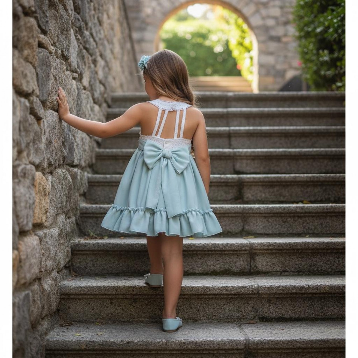 The back features a beautiful design with vertical straps that subtly reveal the back and a large bow in the same aqua green tone, enhancing the overall look and adding a special touch.