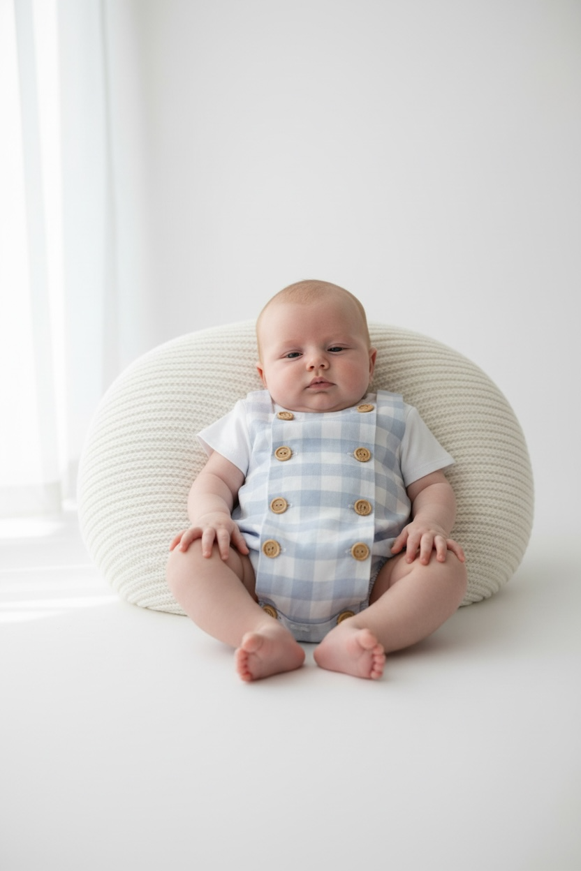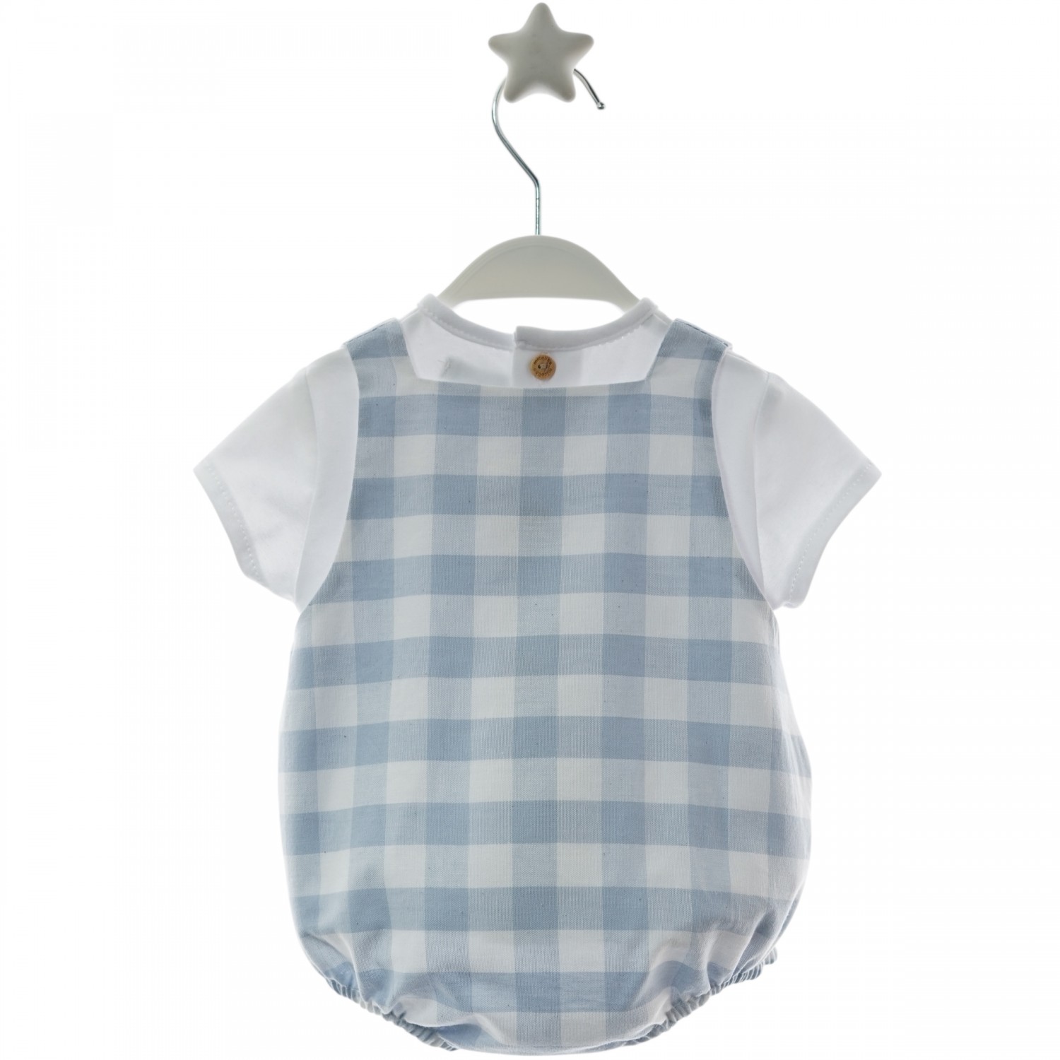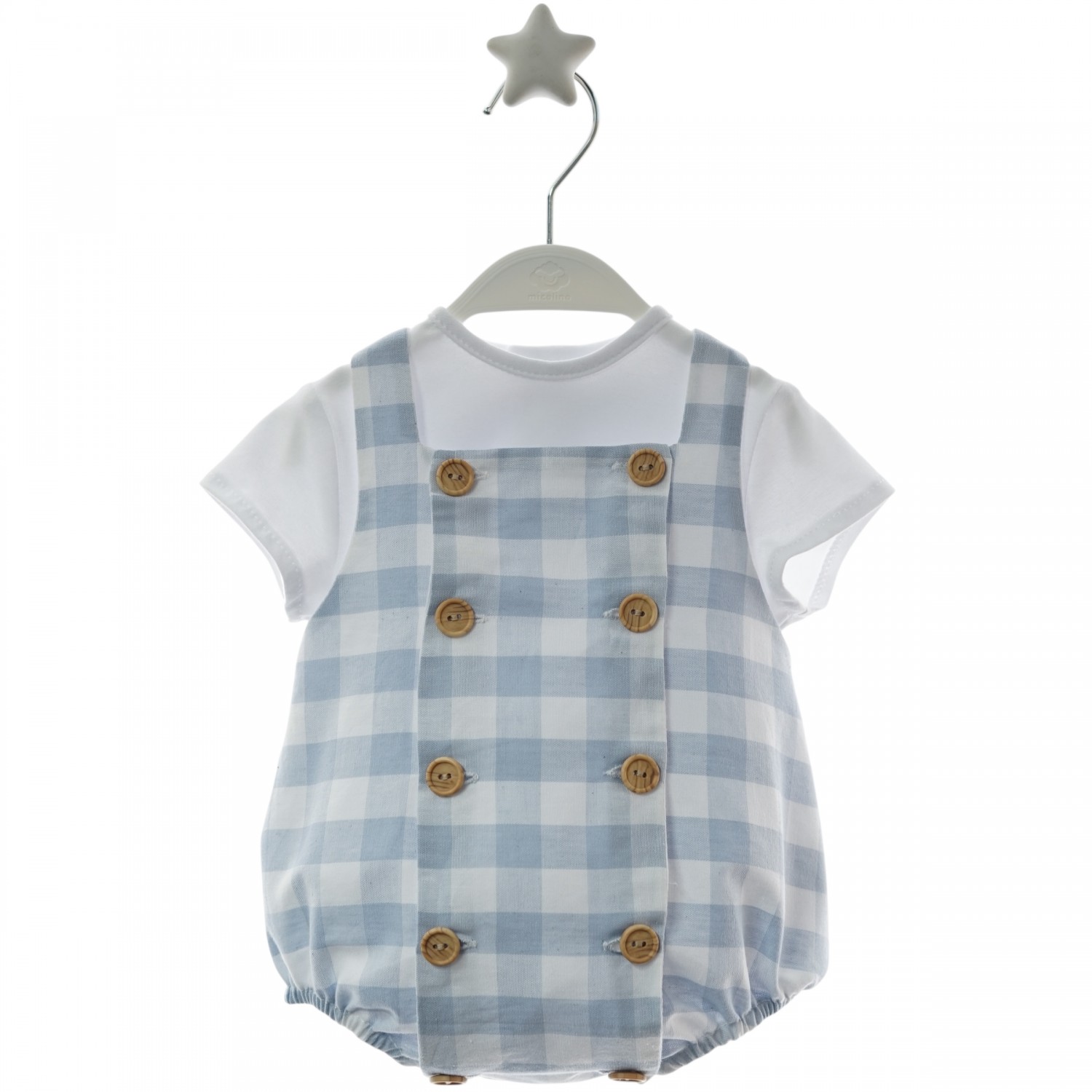 Baby romper in a dusty blue gingham print and white cotton t-shirt, a beautiful basic from the New Spring/Summer Collection for cool and comfortable looks.
