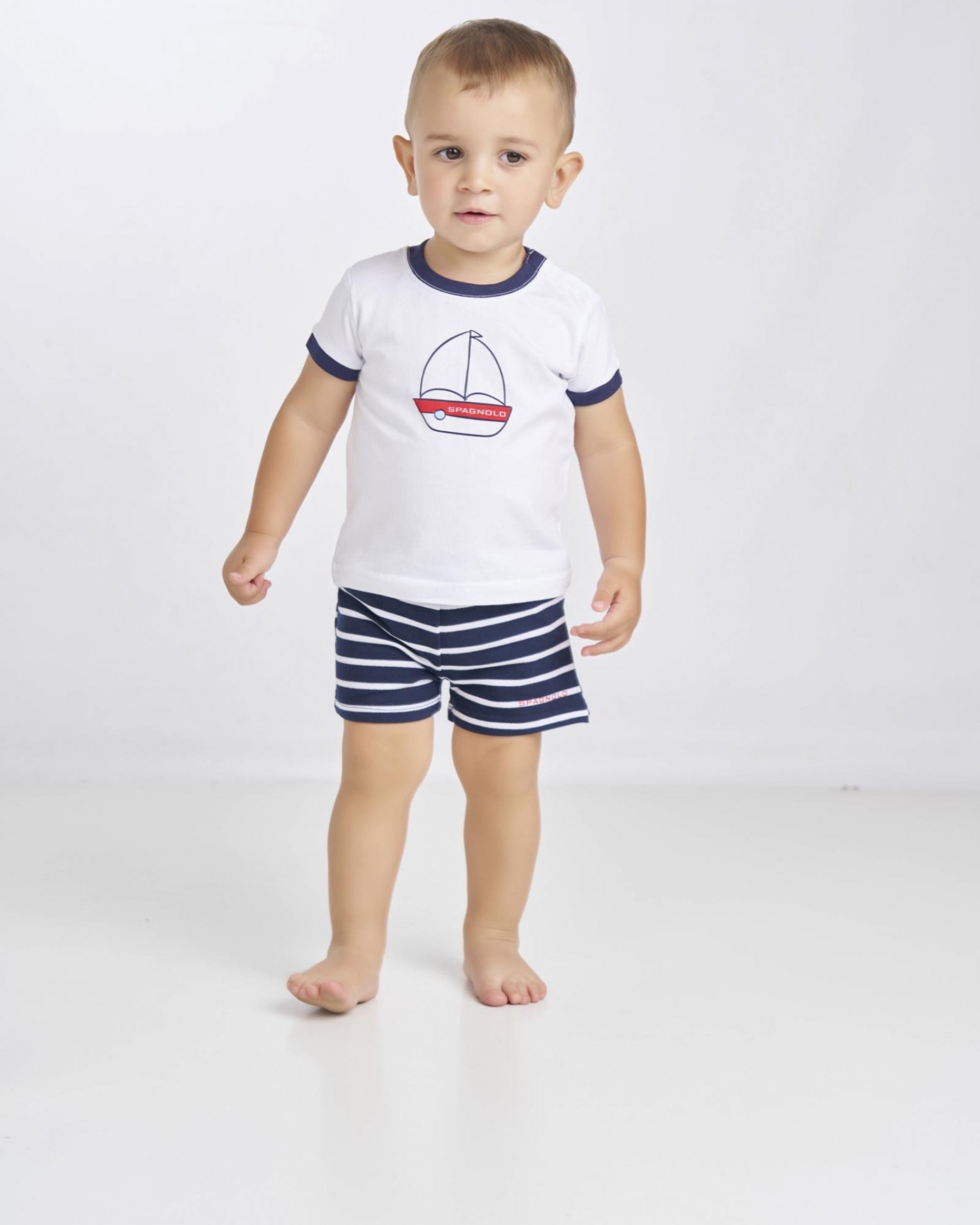 Made of 100 x 100 cotton. White t-shirt with a boat and navy trim. Short striped pants.