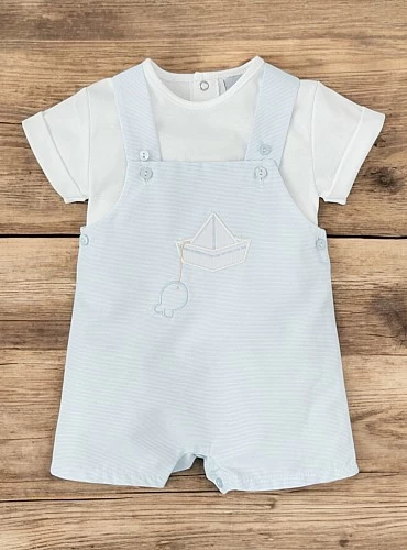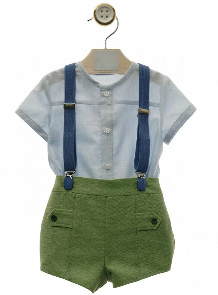 Blouse, pants and suspenders. Blue blouse with yoke, moss green pants and blue suspenders.
