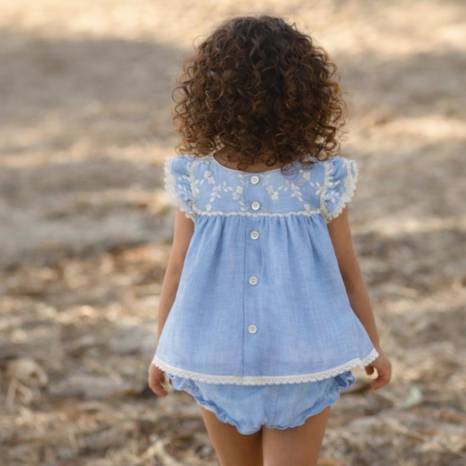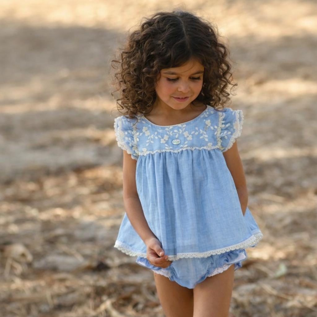 The matching bloomers complete the set, maintaining the harmony of the fabric and color, creating a beautiful and comfortable look for the little girl.