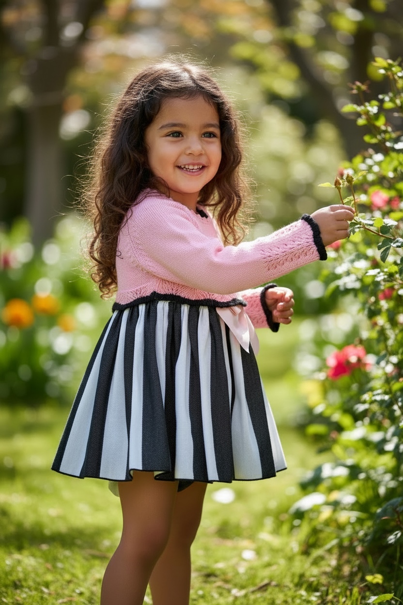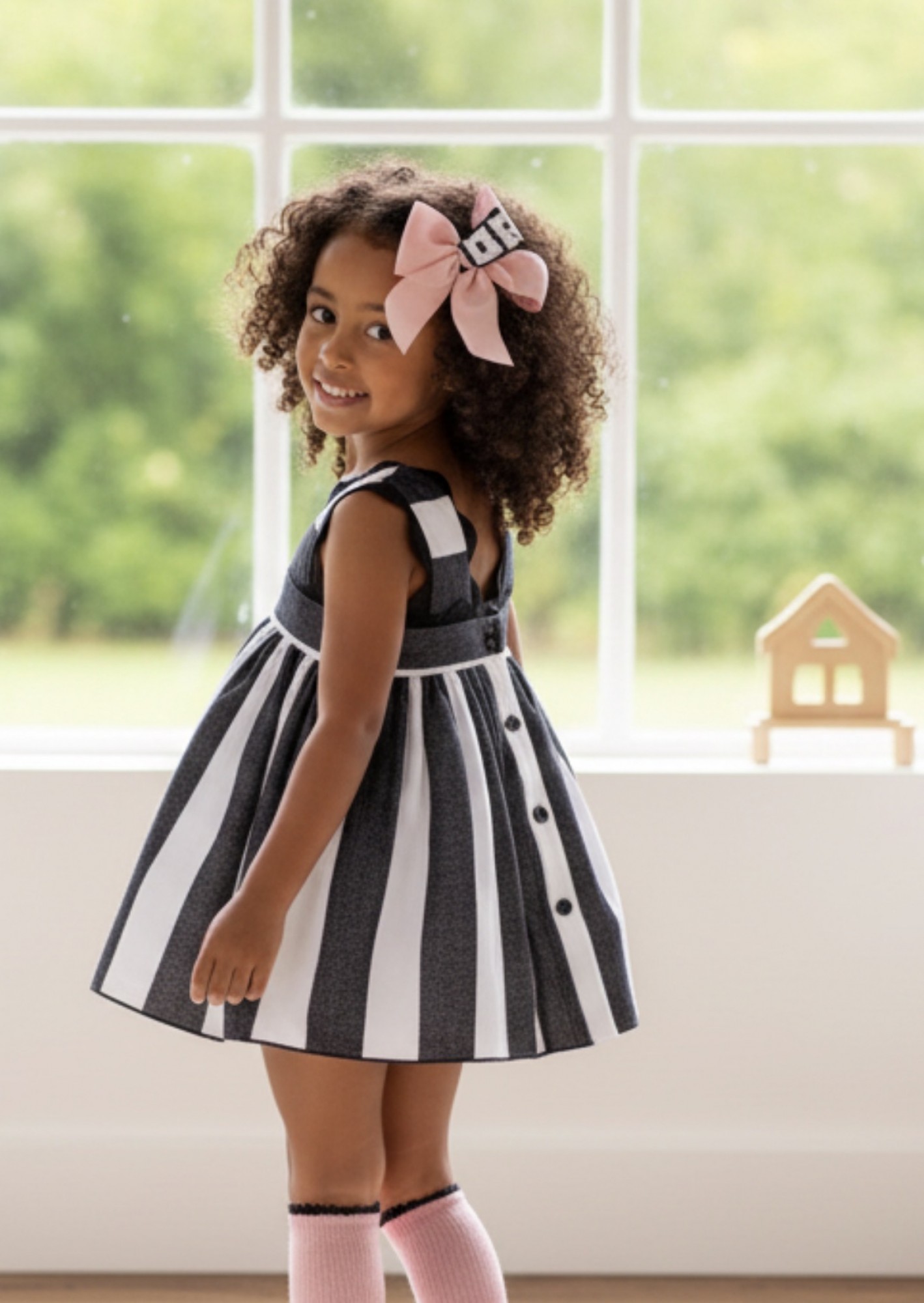 The baby dress is made from a fabric with wide black and white stripes, with a full skirt that looks beautiful on.