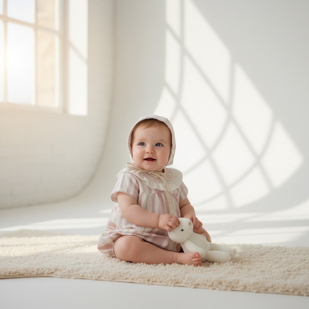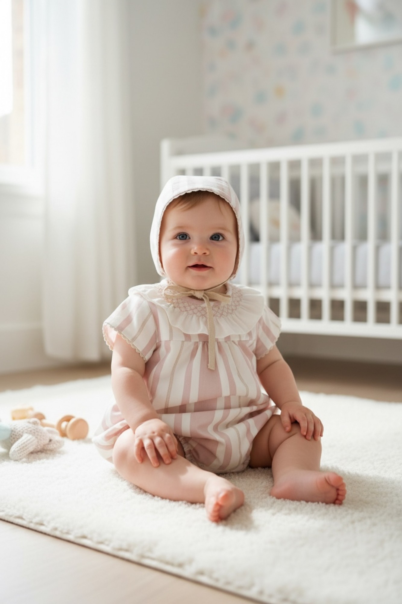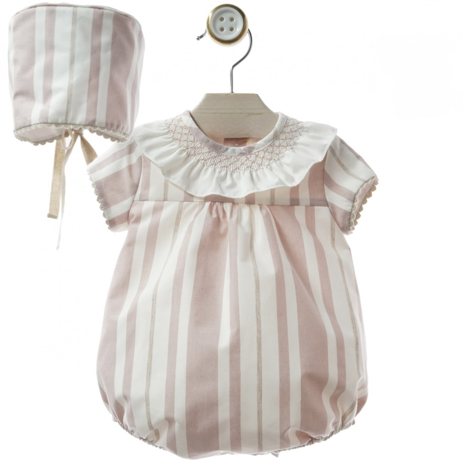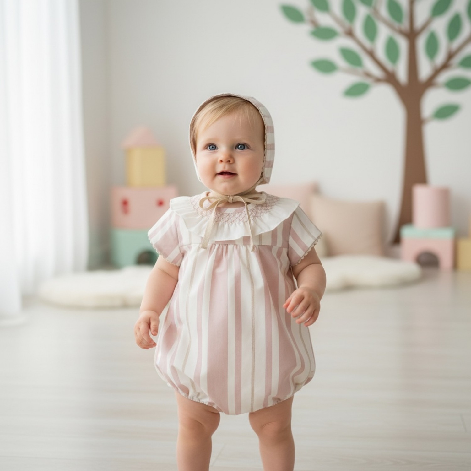 A girl's outfit consisting of a romper and bonnet from the Porcelana collection, crafted from a delicate striped fabric in soft, powdery tones that exudes sweetness and brightness.