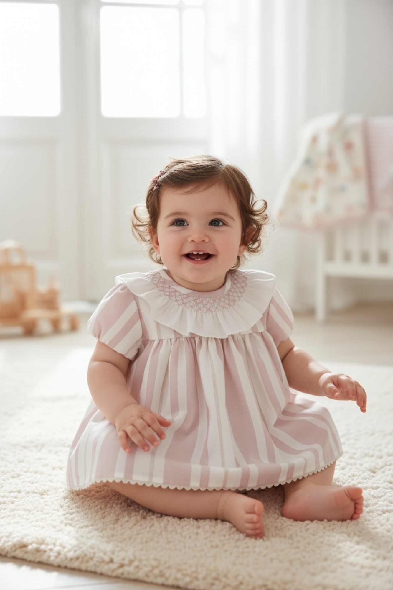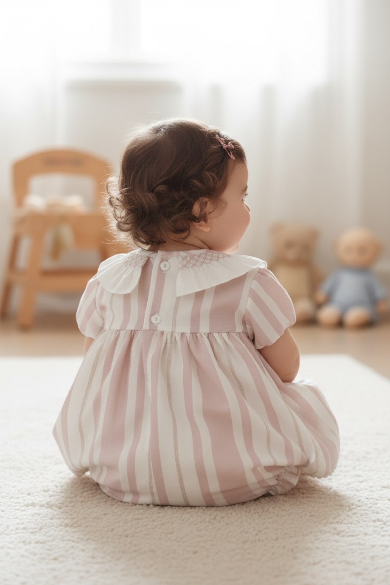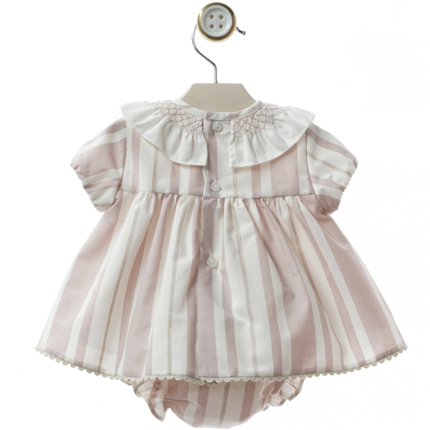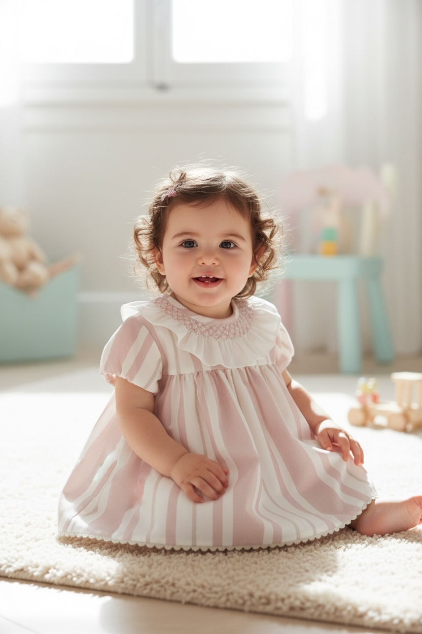 Baby dress with matching bloomers from the Porcelana collection, crafted from a delicate striped fabric in soft, powdery tones that adds brightness and an elegant touch.