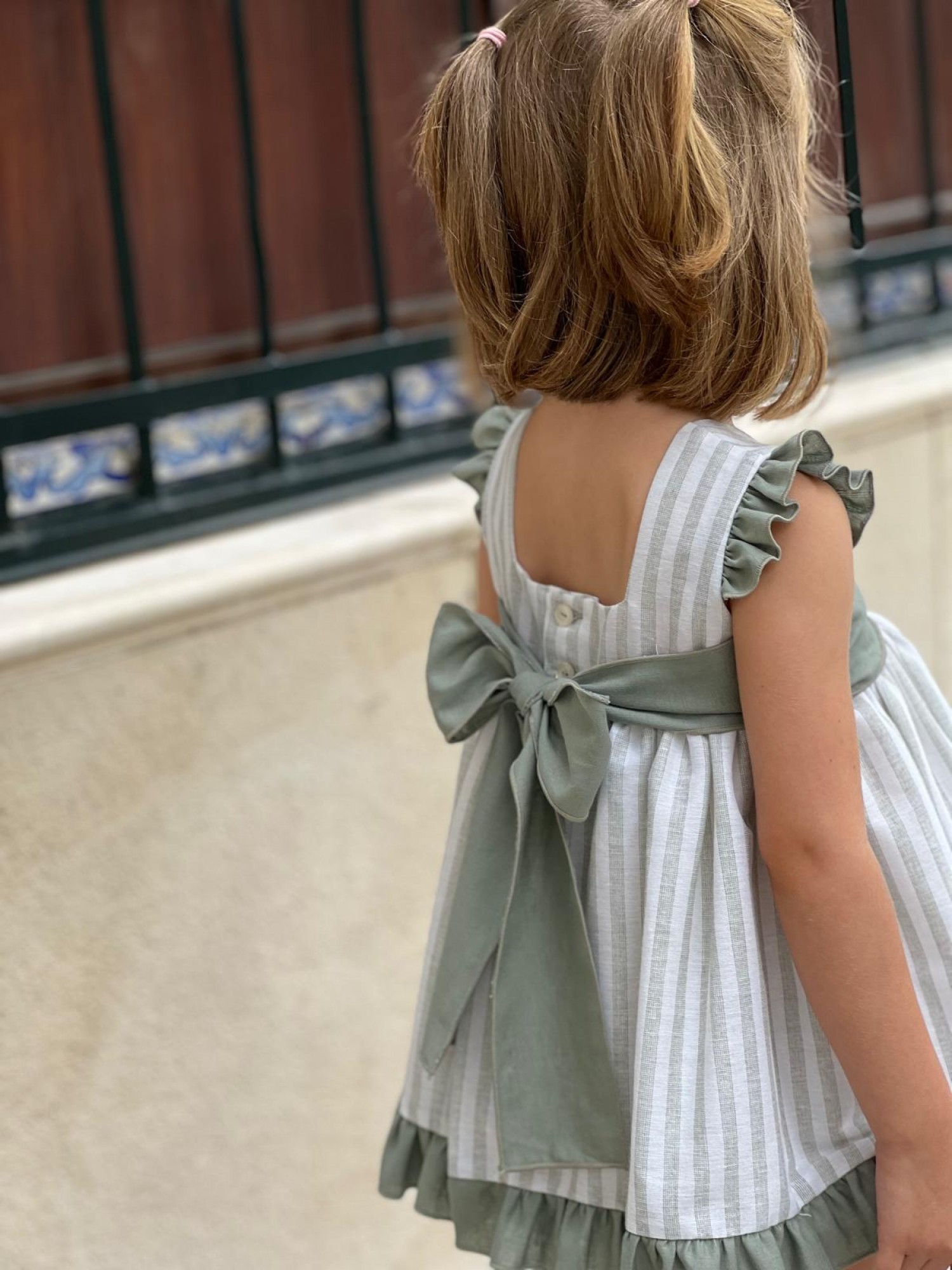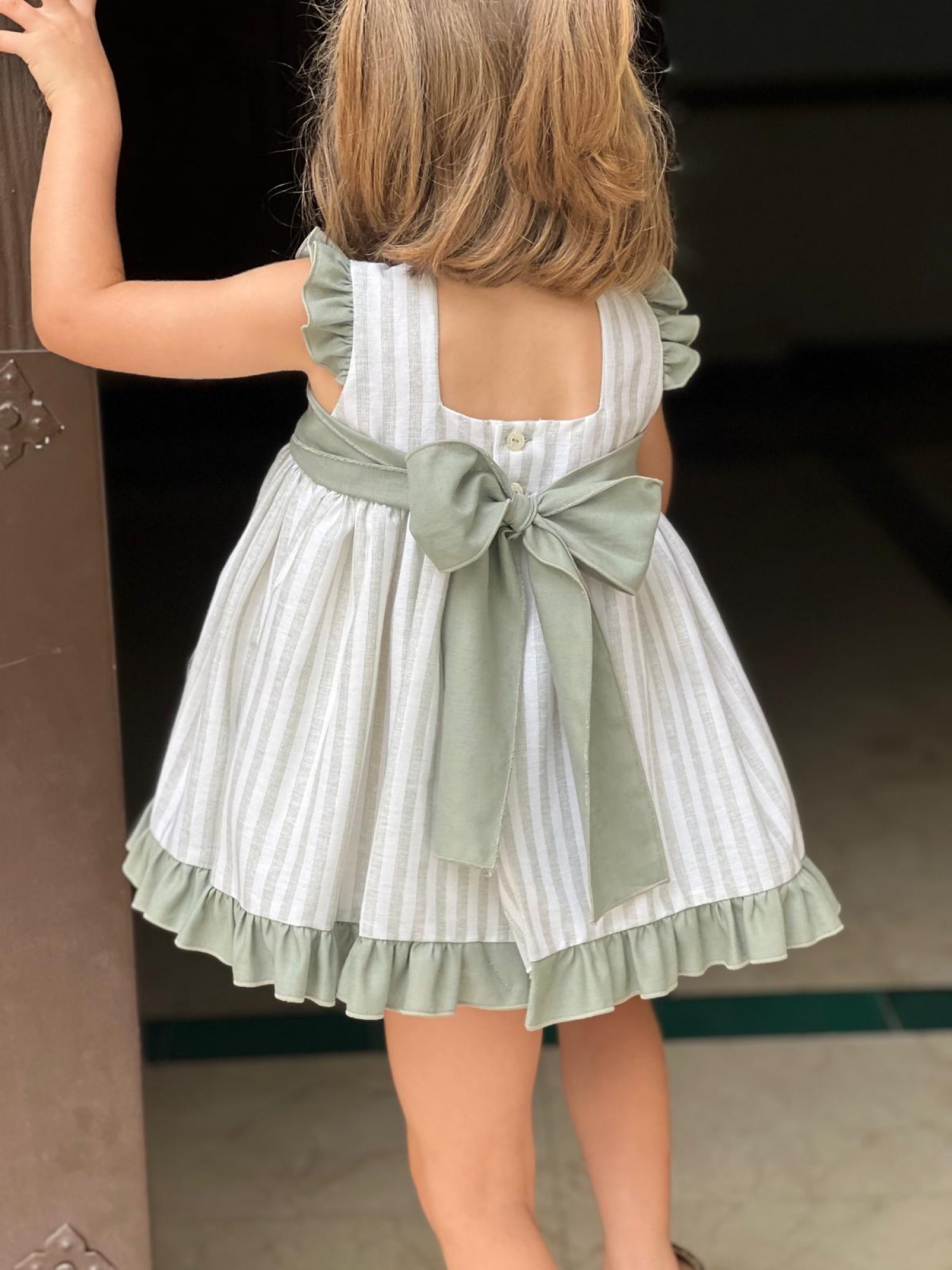 The flared skirt ends in a sage green ruffle that adds movement and a delicate finish. A large bow in the same sage green accentuates the back of the outfit.