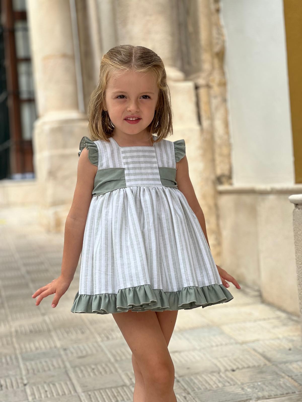 The dress is made of vertically striped fabric in white and sage green. The bodice features a central panel of horizontal stripes that provides a lovely contrast, complemented by small sage green ruffles at the shoulders.