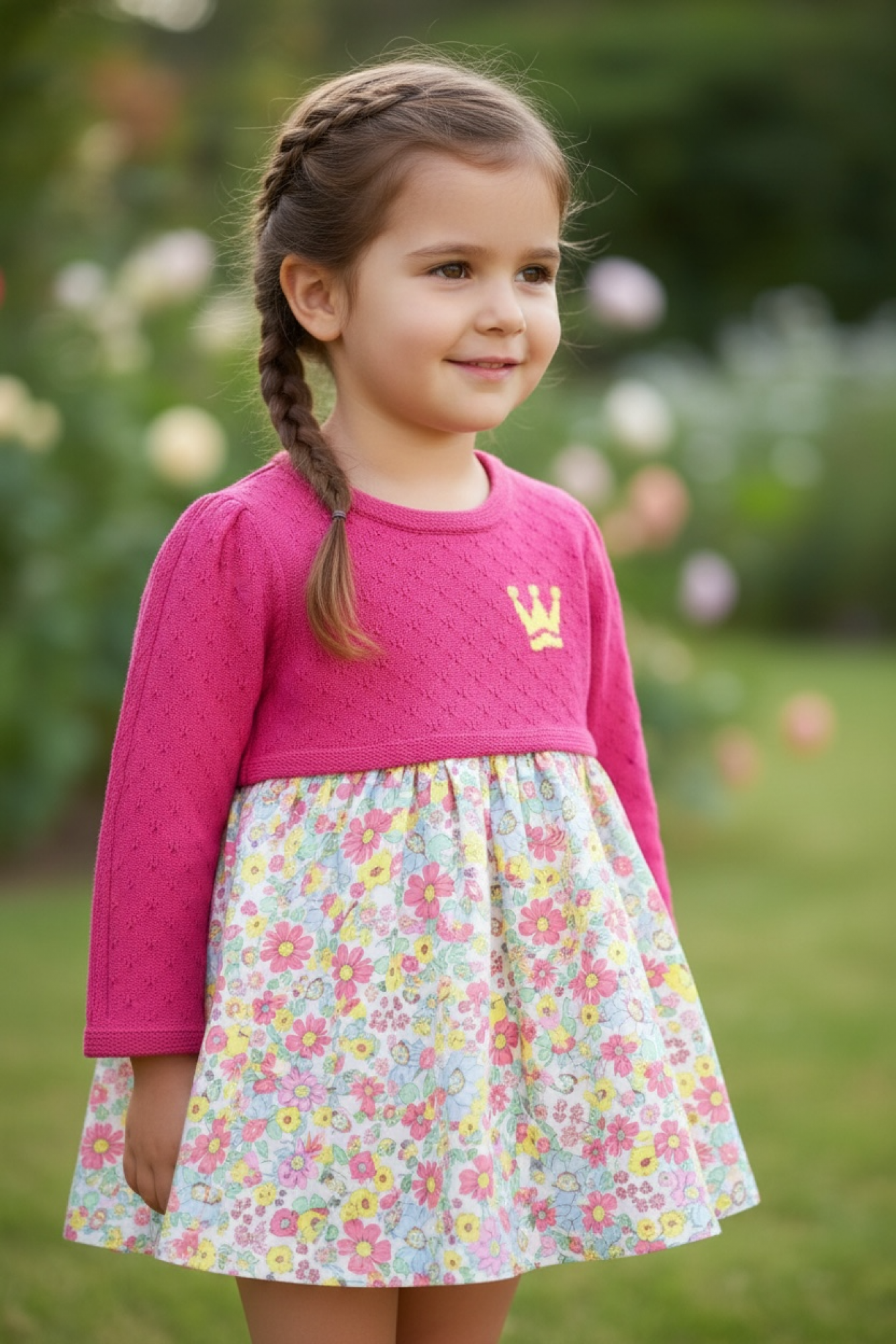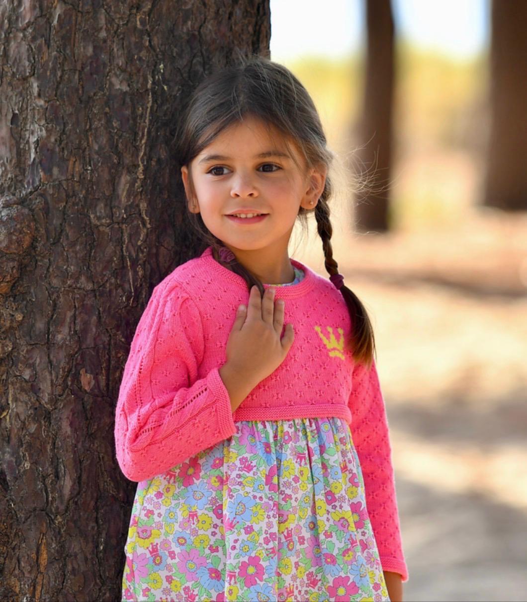 A matching baby romper with bloomers and a sweater from the Cosima collection by Eva Castro, in a very special combination of knit and printed fabrics. The sweater is made of fuchsia knit with an openwork design and an embroidered crown detail in yellow, a signature of the brand.