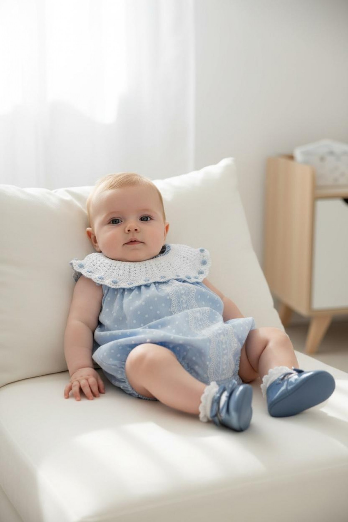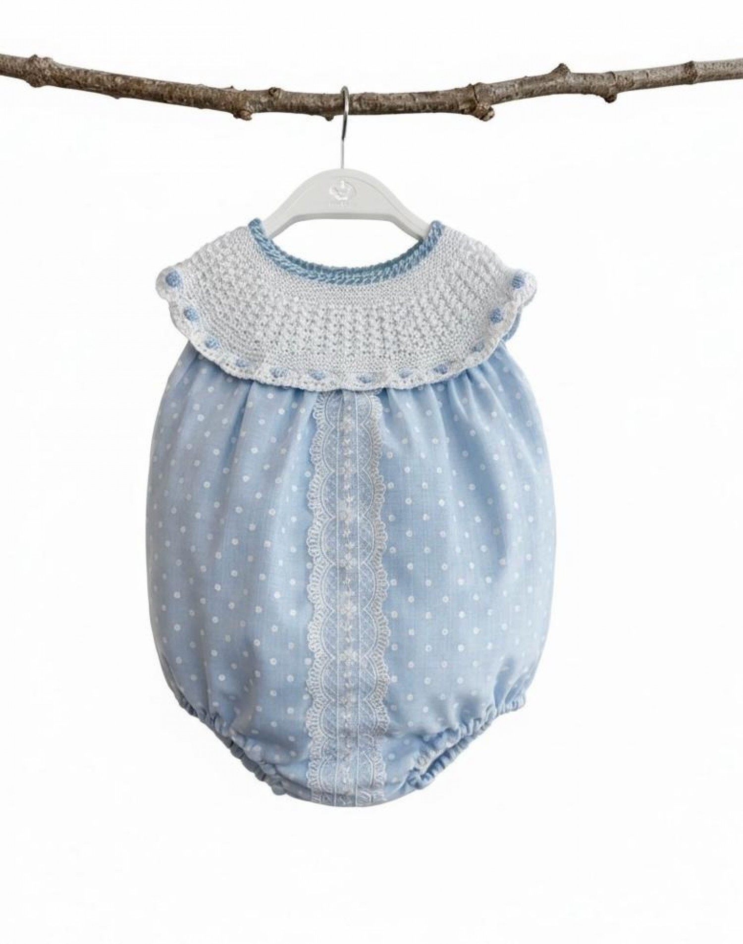 The bodice features delicate embroidery on the tulle forming small motifs, with a central band of embroidered lace that flatters the garment and gives it a refined finish. The Peter Pan collar in fine white knit with blue trim adds a classic and distinguished touch. This lightweight garment, with its soft volume and delicate finish, is ideal for special occasions and ceremonies.