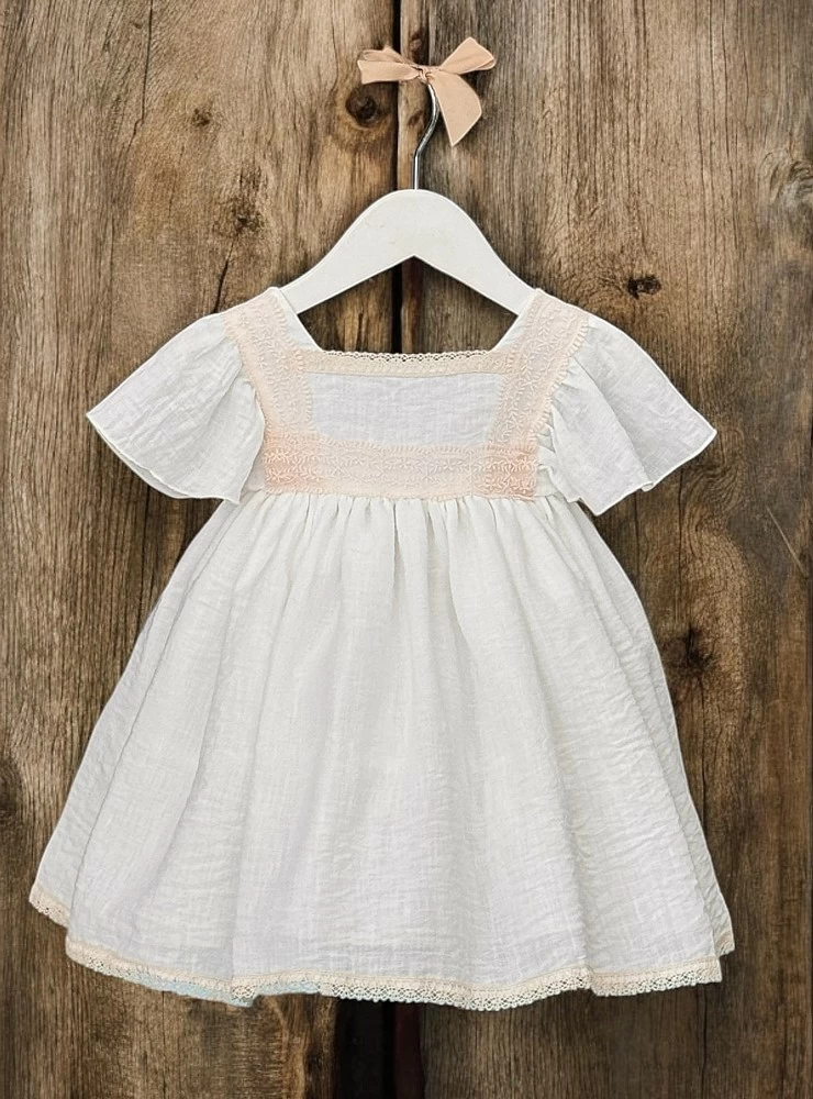 Made of beige linen Bambula. It has a high waist, with a slightly higher beige embroidered tulle lace, a ruffled sleeve and a bow on the back with the same fabric. It has several layers of lining to give it volume. Perfect for any event.