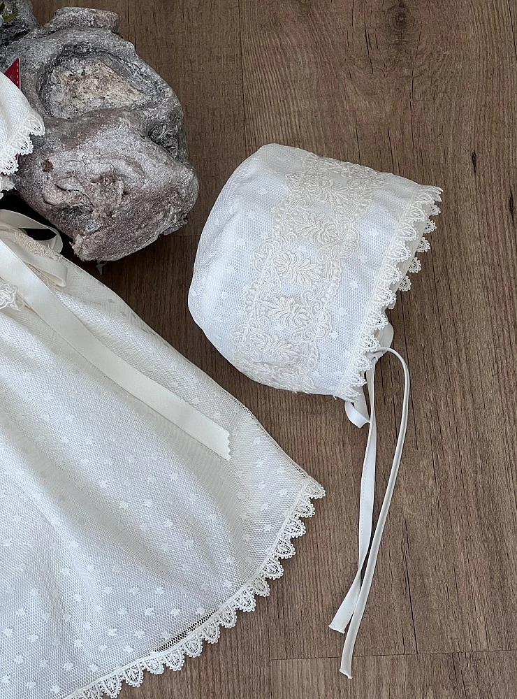 Beige tulle dress and bonnet set.