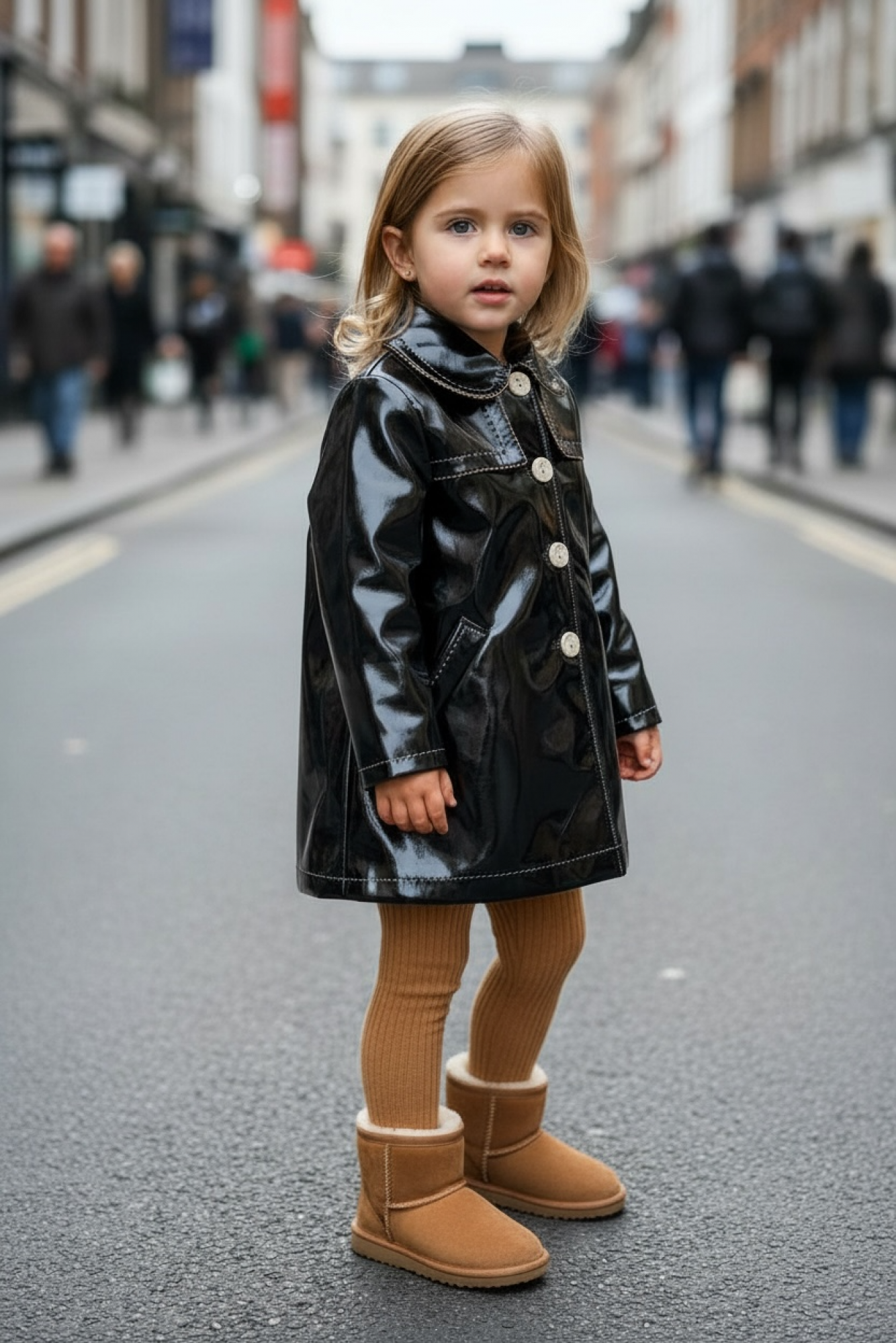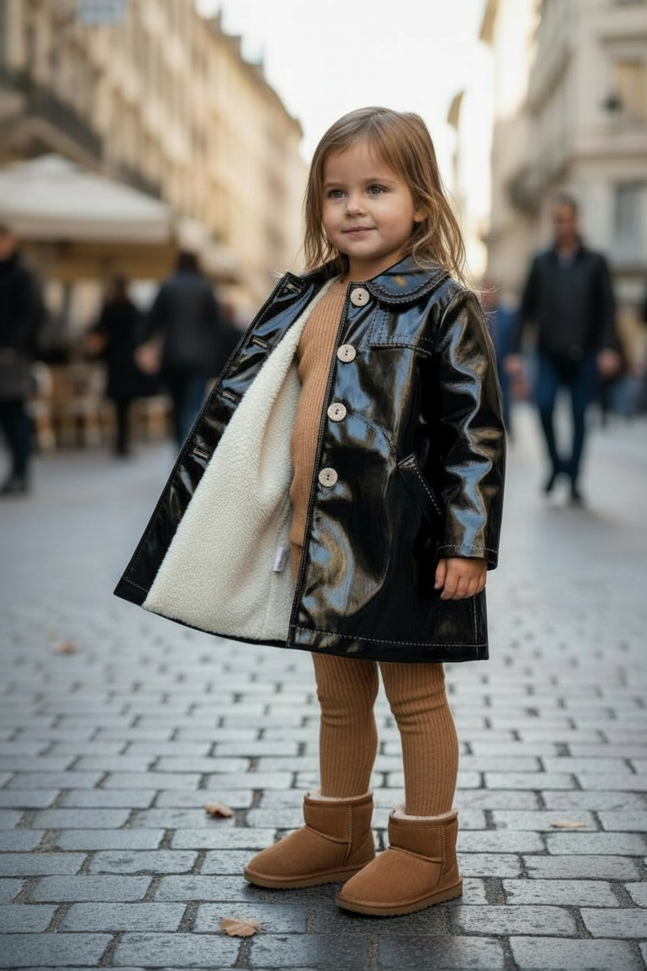 Made in black patent leather with camel stitching, it has lapels and round collars