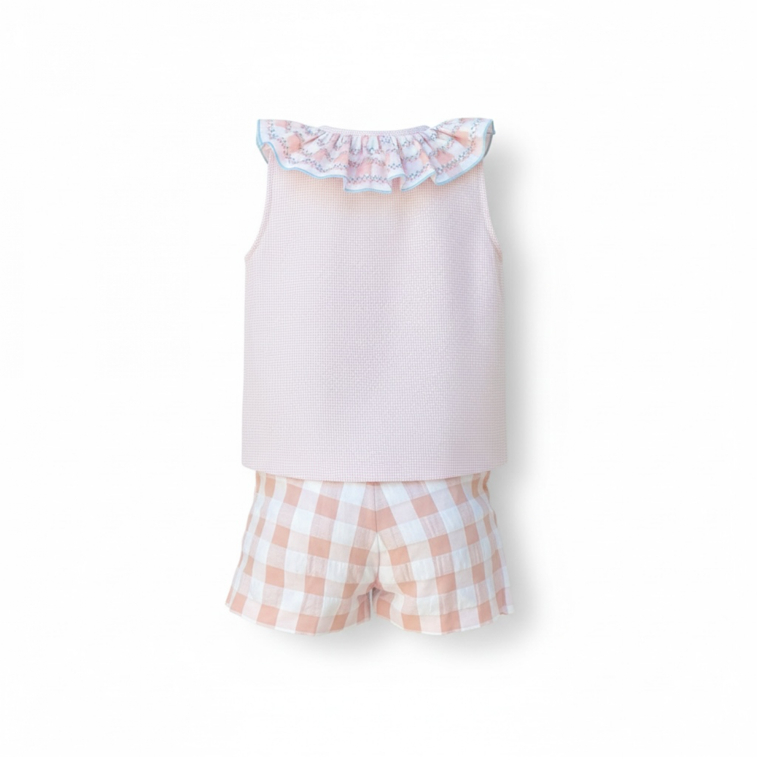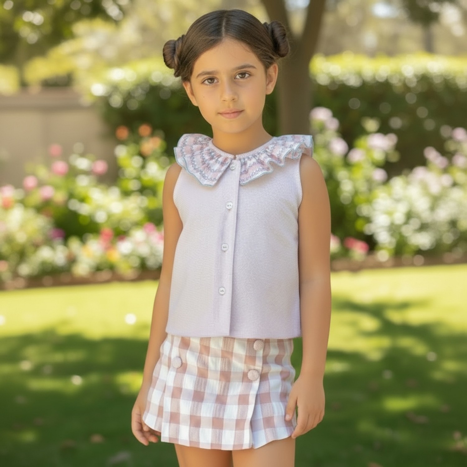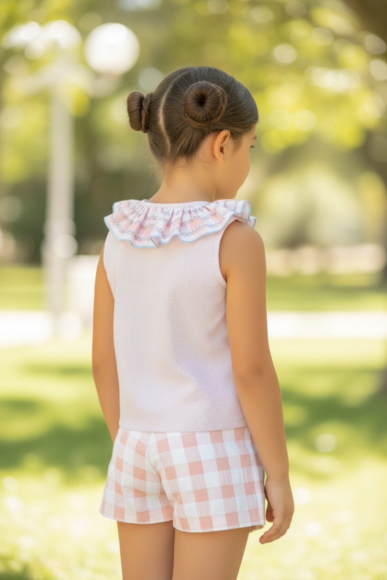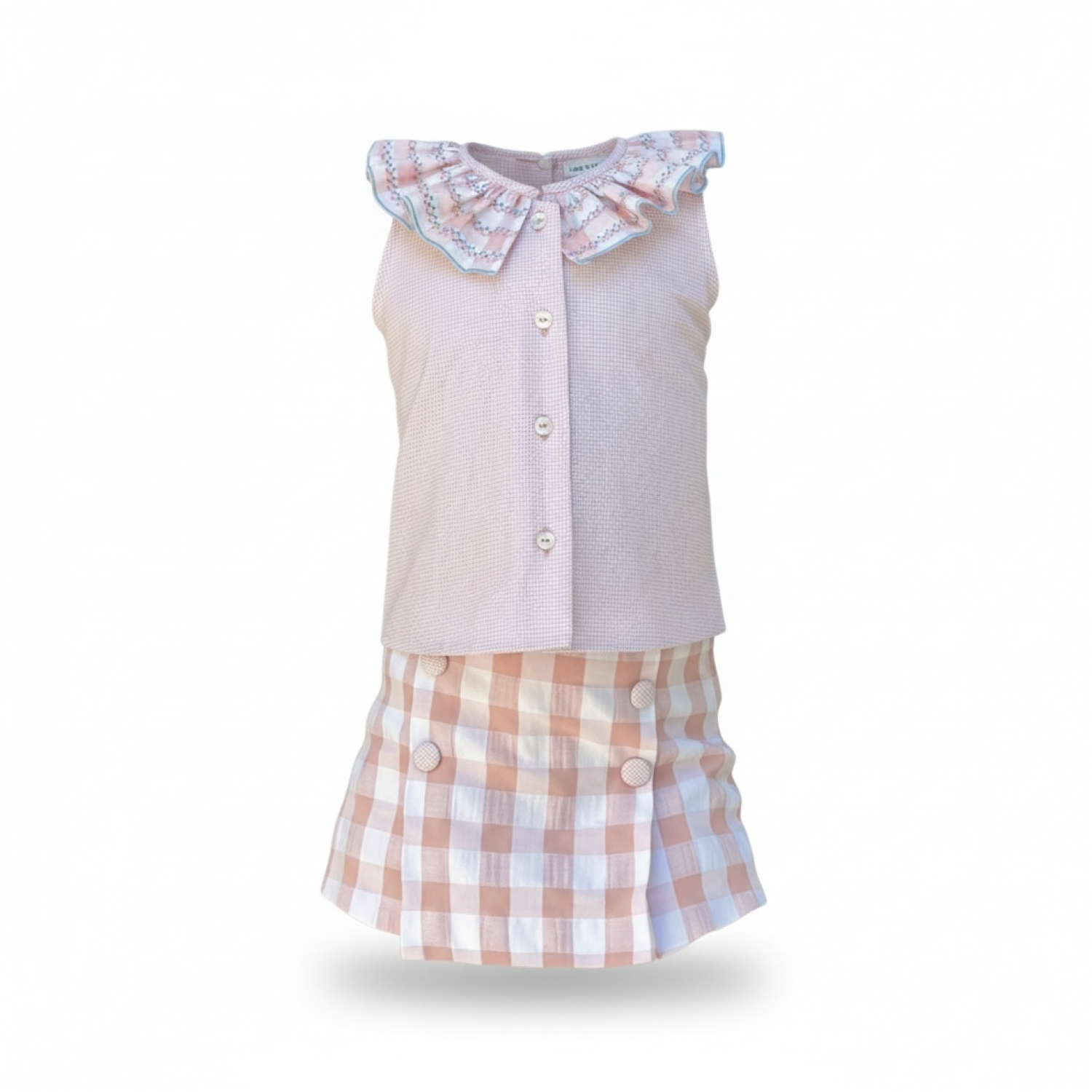 The culottes feature a large pink and white check pattern and covered buttons for a special touch.