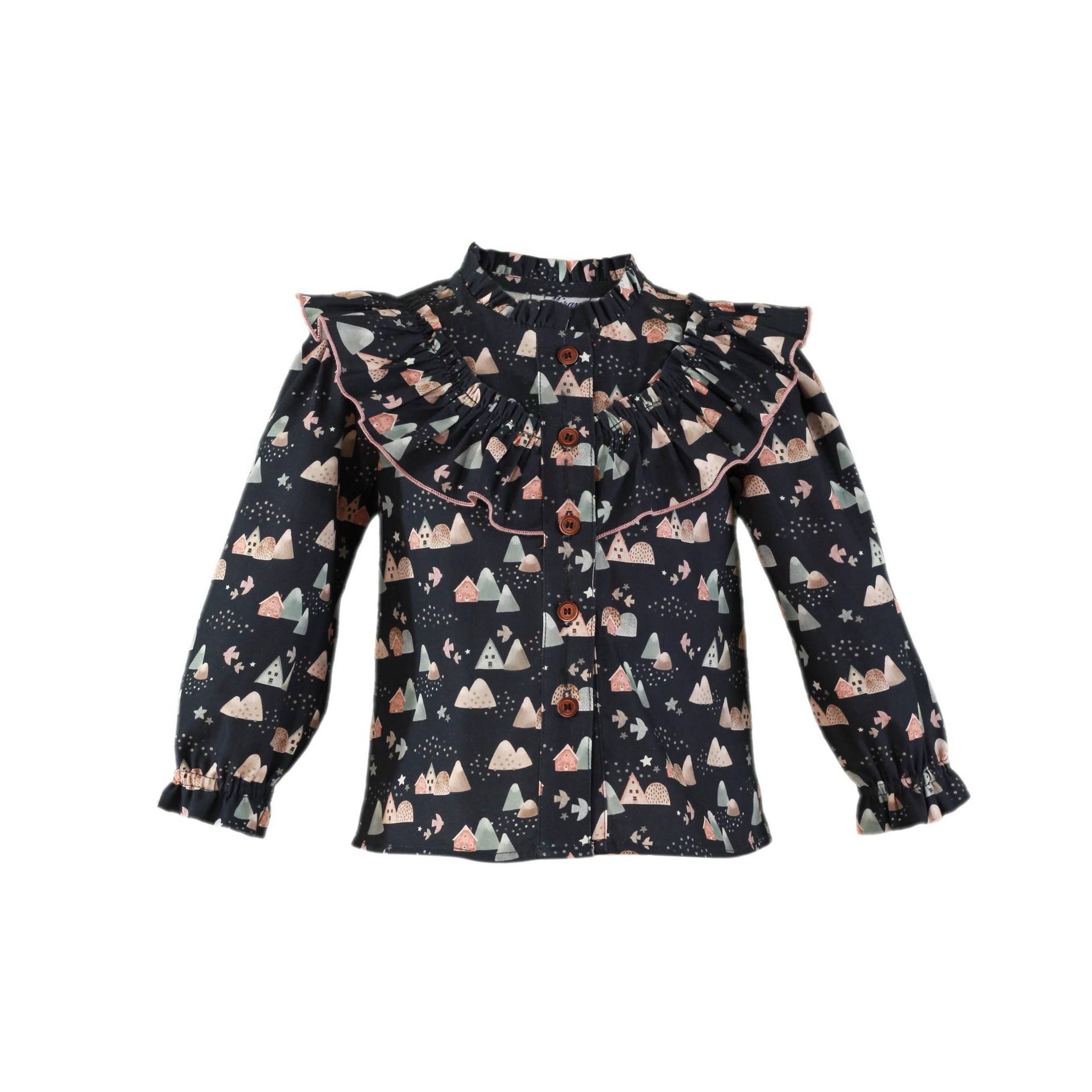 Navy viella blouse with a pretty cassia print in grey and brick tones with a brick-coloured skirt-pants