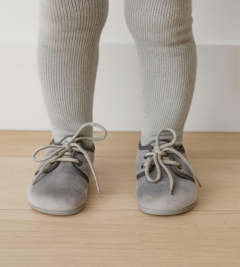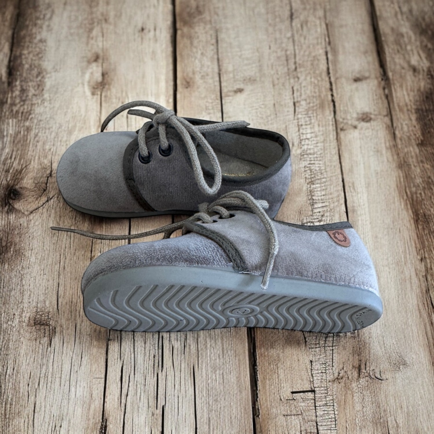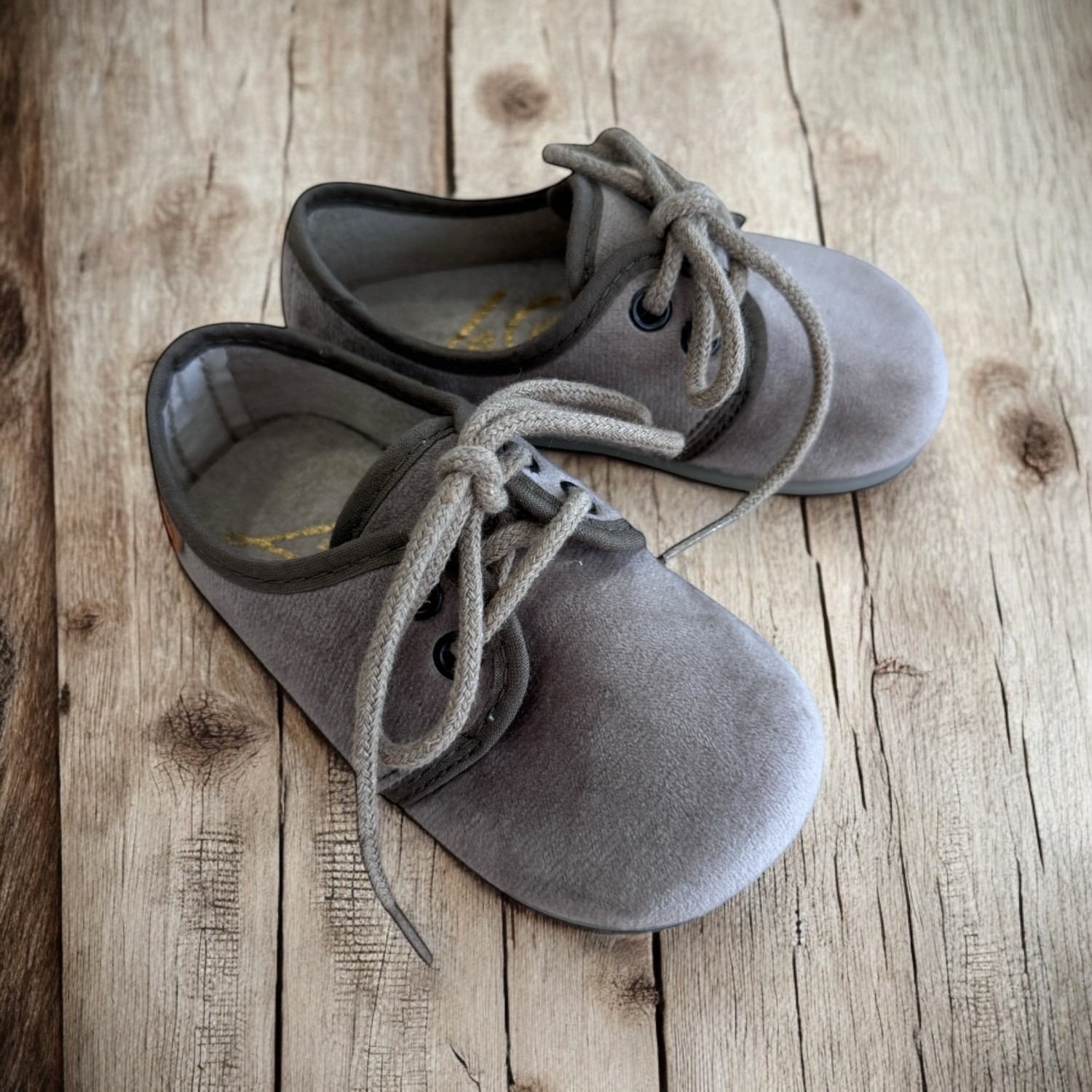 Children's shoes in soft, stone-colored velvet, designed with a focus on sustainable footwear.