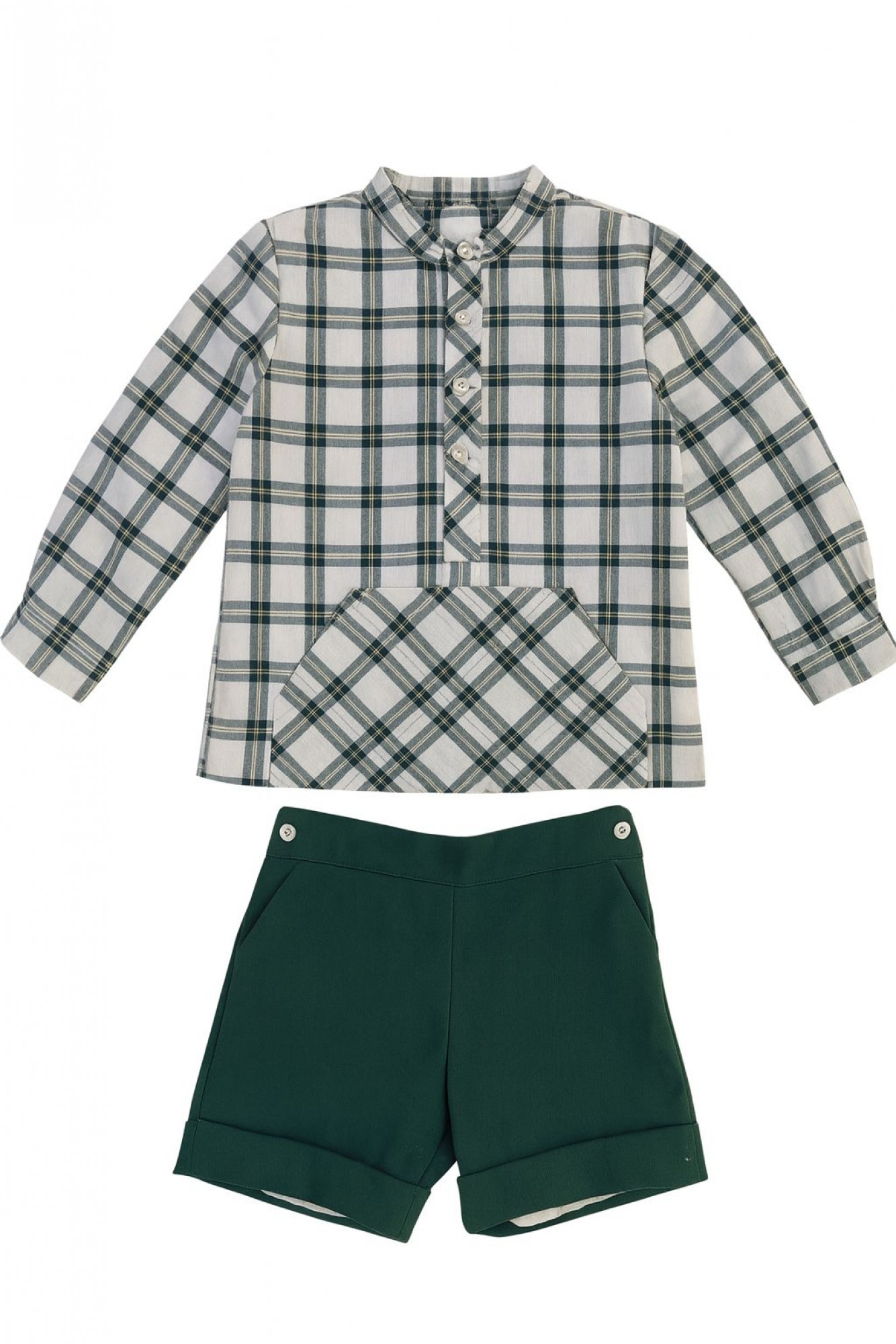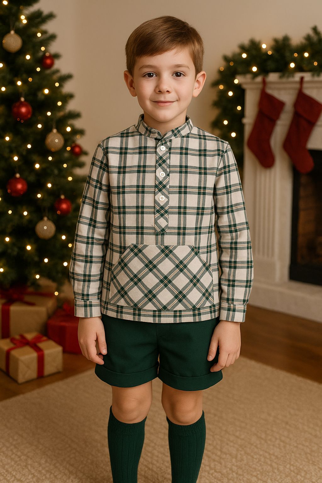 This boys' outfit features a long-sleeved shirt in a green and off-white plaid pattern, with a mandarin collar and a button-down front. The diagonally placed pocket adds a modern, original touch while maintaining a classic and elegant style.