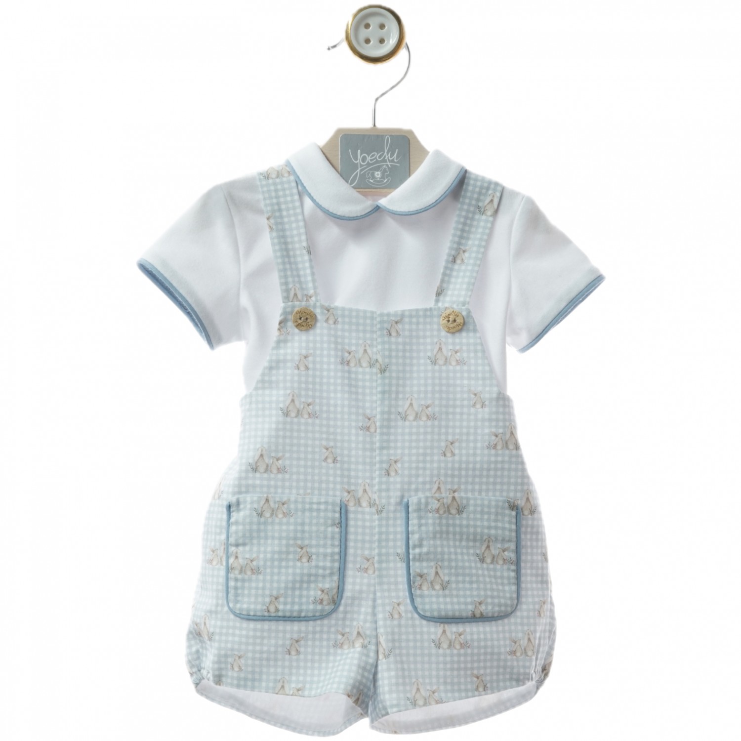 The dungarees, made of a printed fabric with a small-check background in dusty blue, have straps fastened with wooden buttons and welt front pockets.