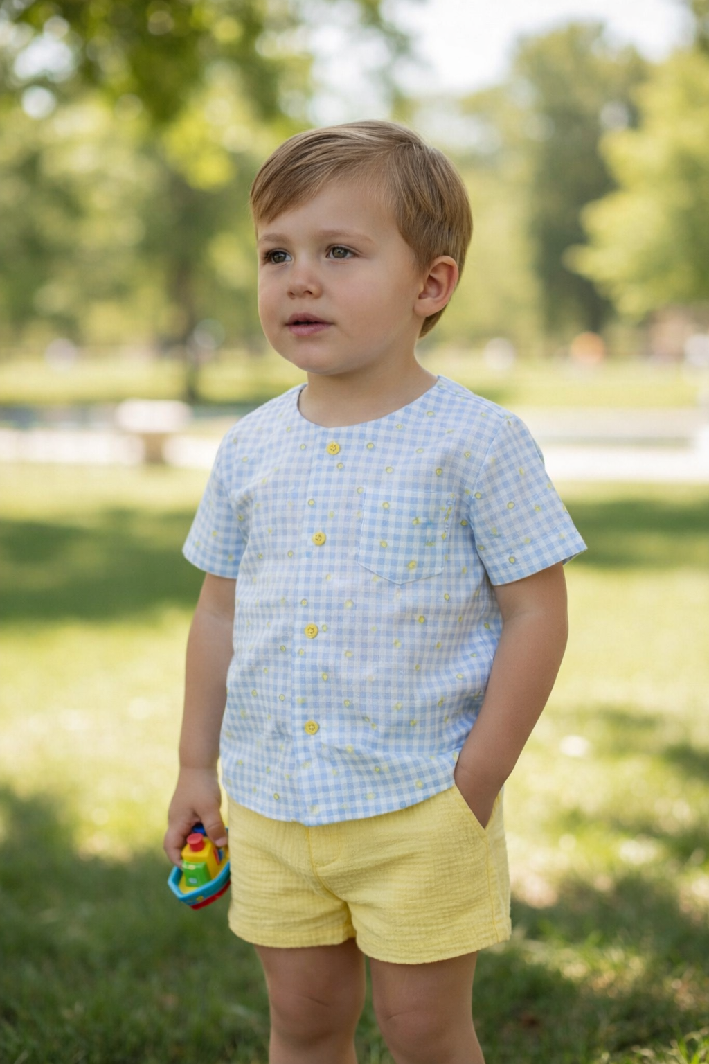 The shirt is light blue gingham with a fun and sweet yellow lemon print. It features a round neck and a placket with contrasting yellow buttons, which brighten the outfit and look lovely.