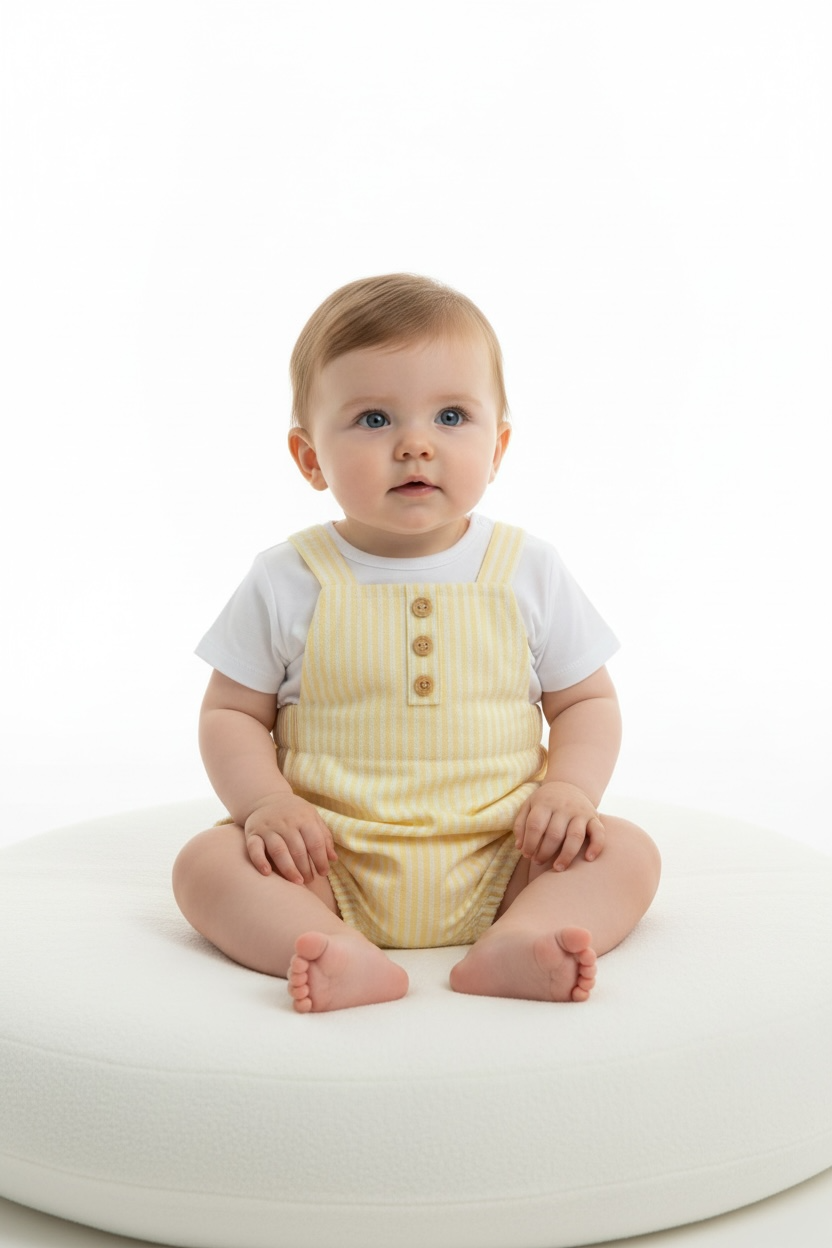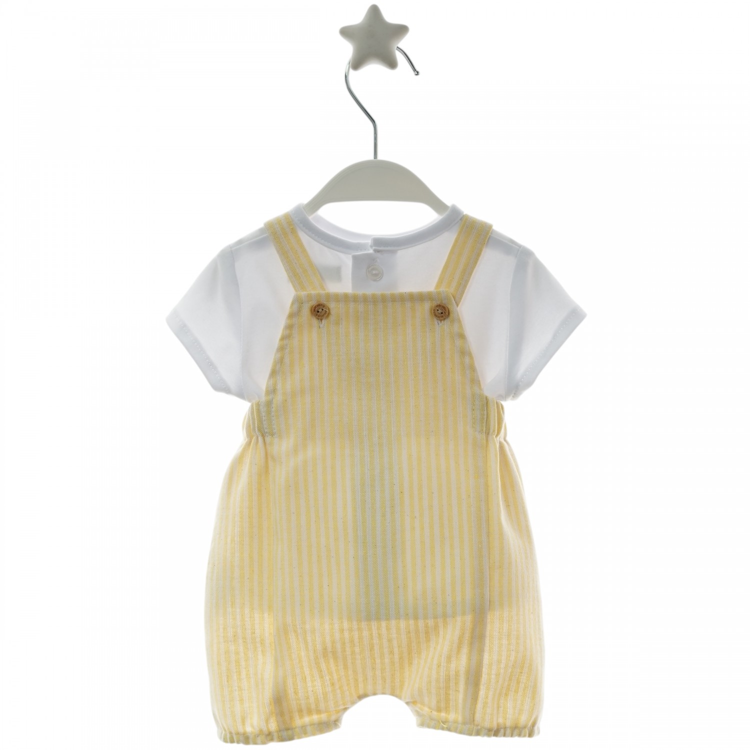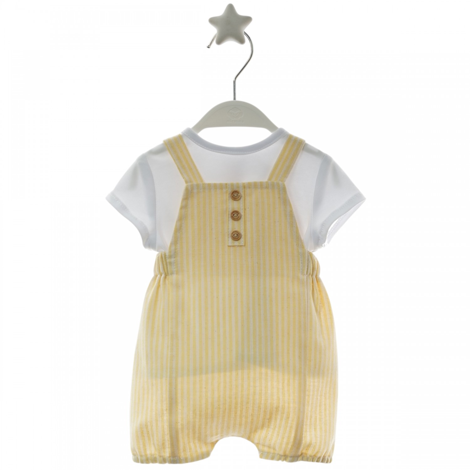 Baby set with a white t-shirt and soft yellow striped romper, ideal for spring and summer.