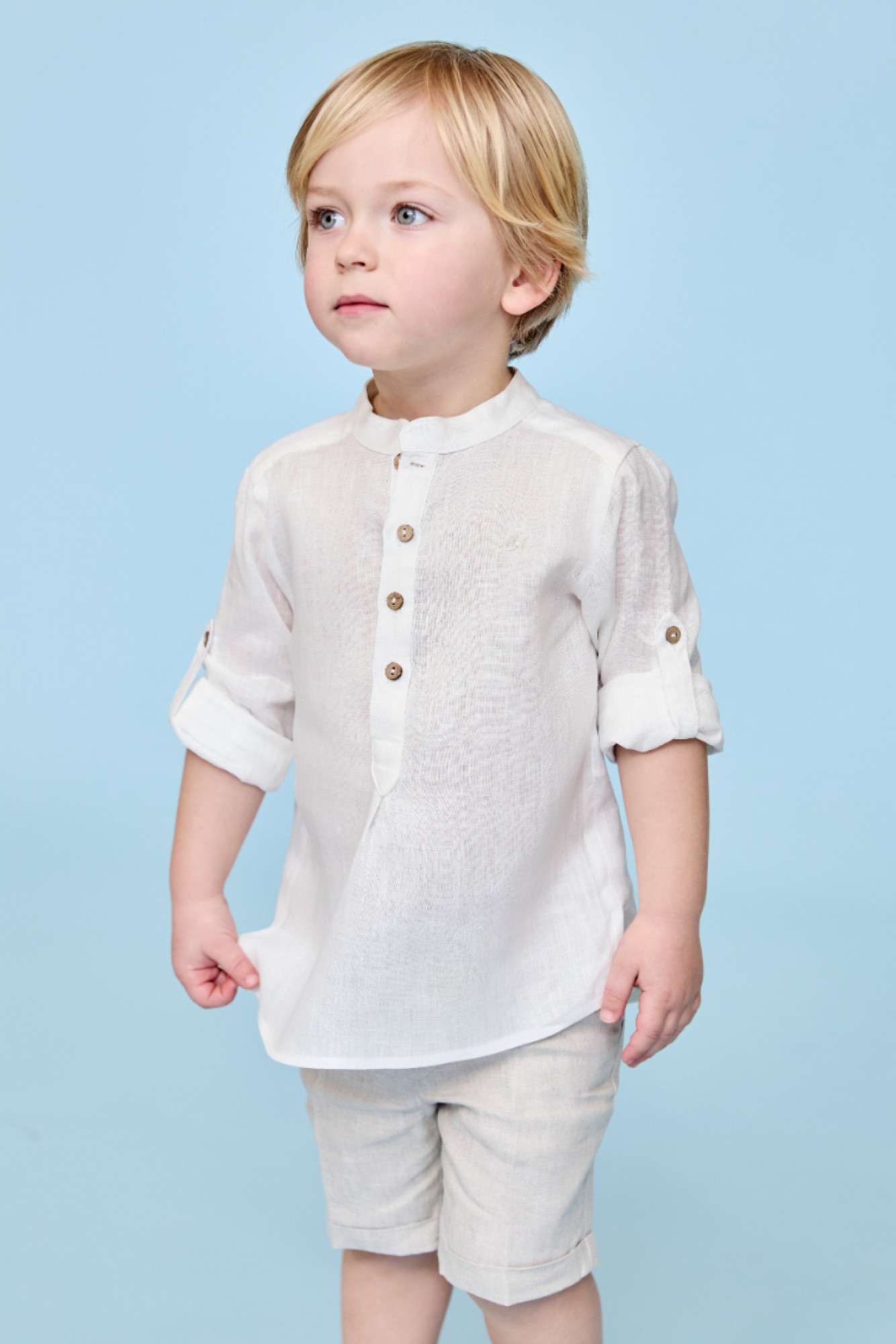 Camisa de lino color beige con cuello Mao, lleva botones de madera, lleva tira en el codo y botón para poder remangar. Pantalón de lino color arena por encima de la rodilla.