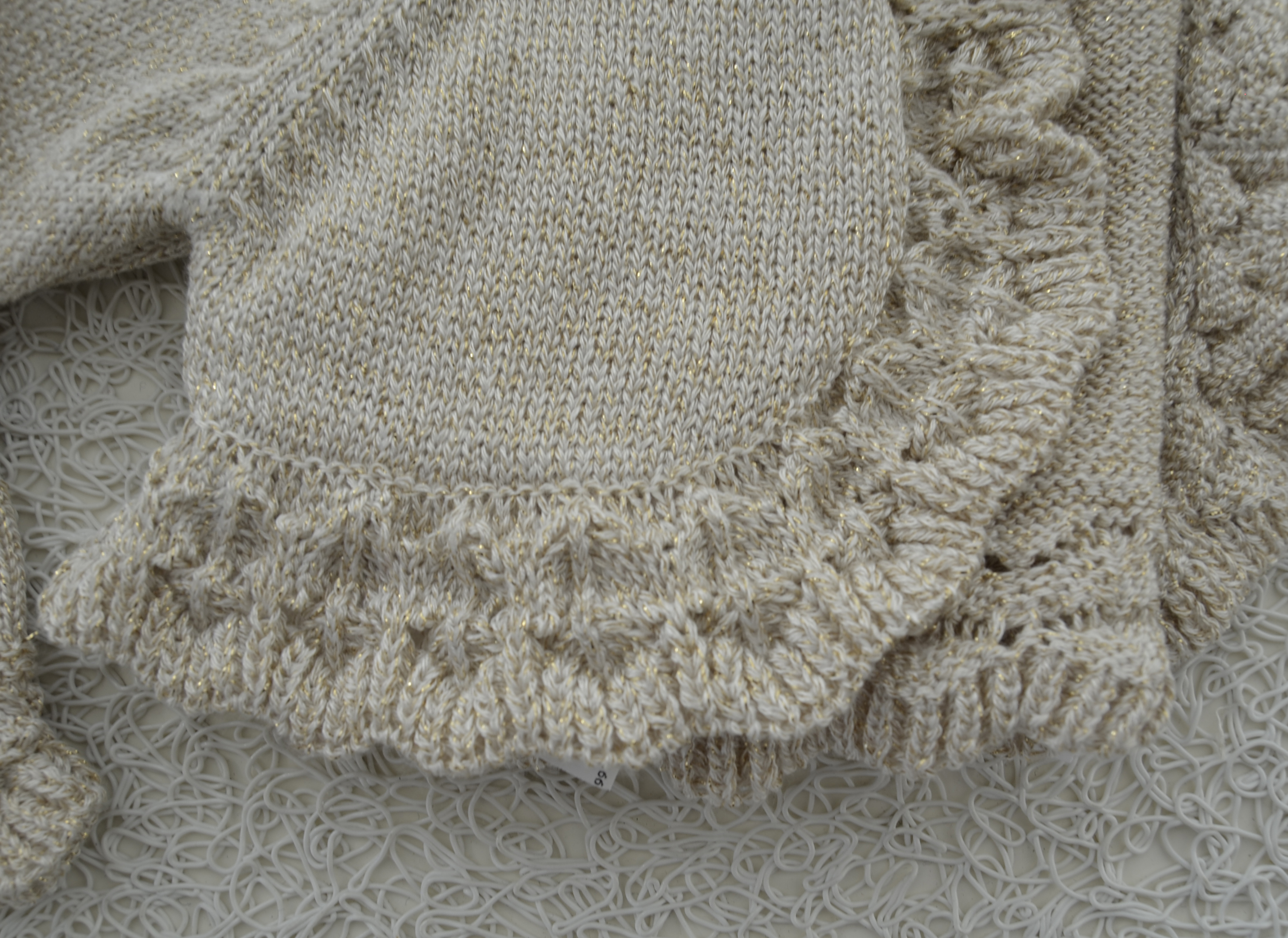 Bonita chaqueta corta o bolero confeccionado en un fino punto color lino con hilo de oro. Es ideal para vestir. Bautizo o arras. Muy fina y elegante.