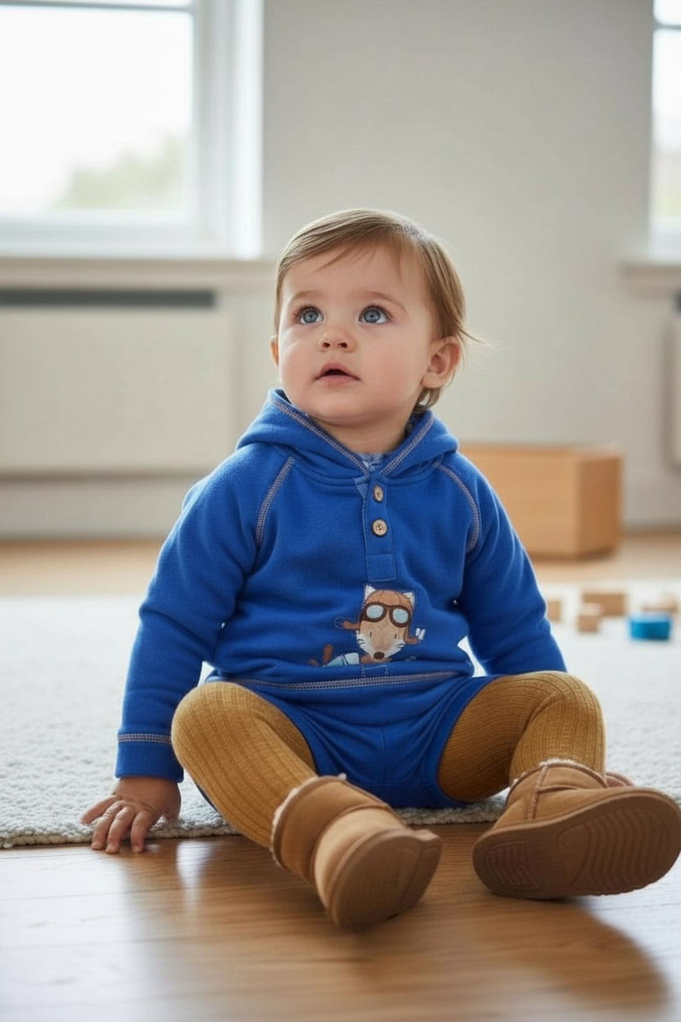 The sweatshirt, with a polka-dot-lined hood, features a cute aviator fox in the center for a fun and original touch.