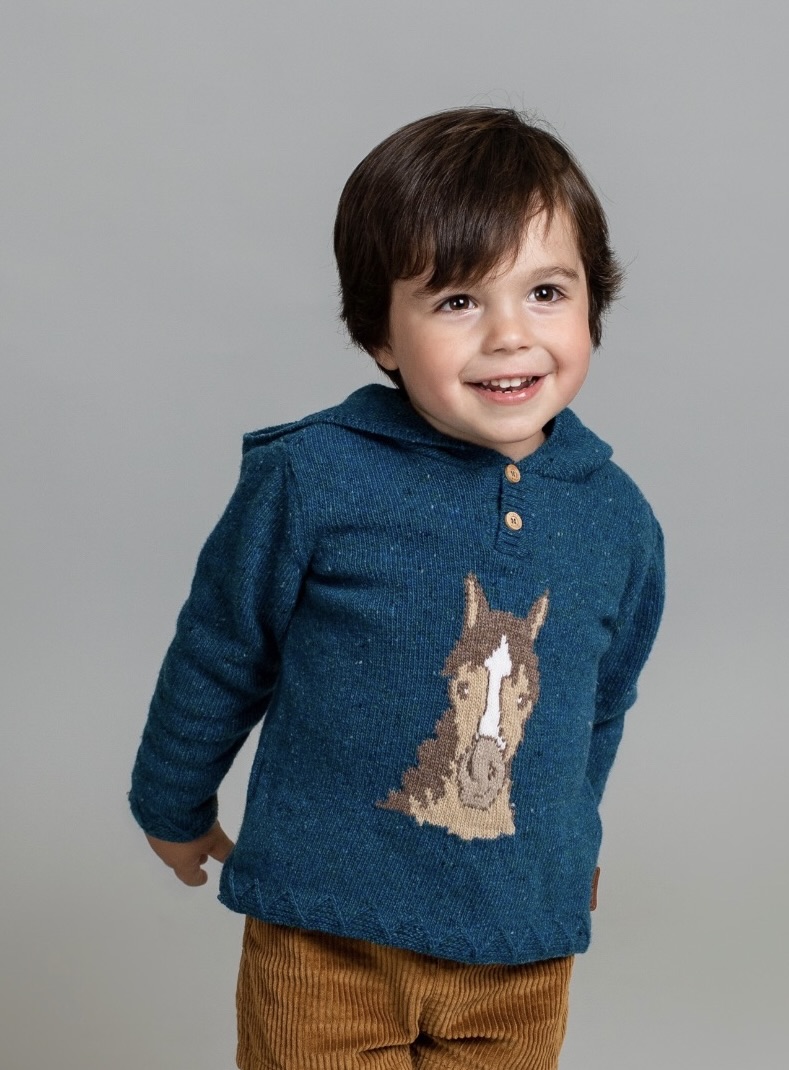 It is made of petrol-colored knitted fabric with a hood and a pretty horse in brown tones.