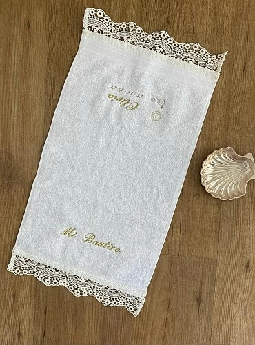 Christening towel in white terry with lace. Custom