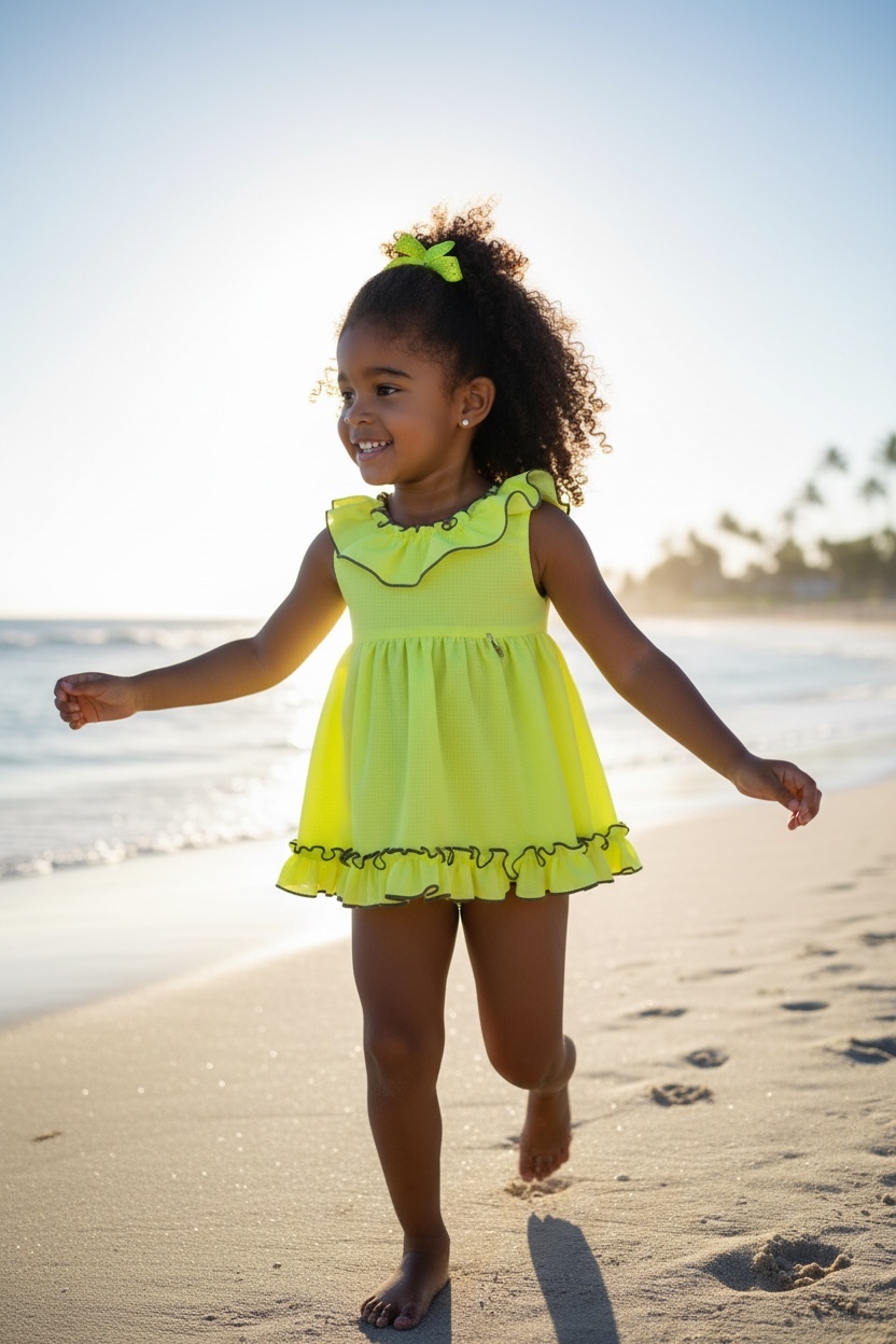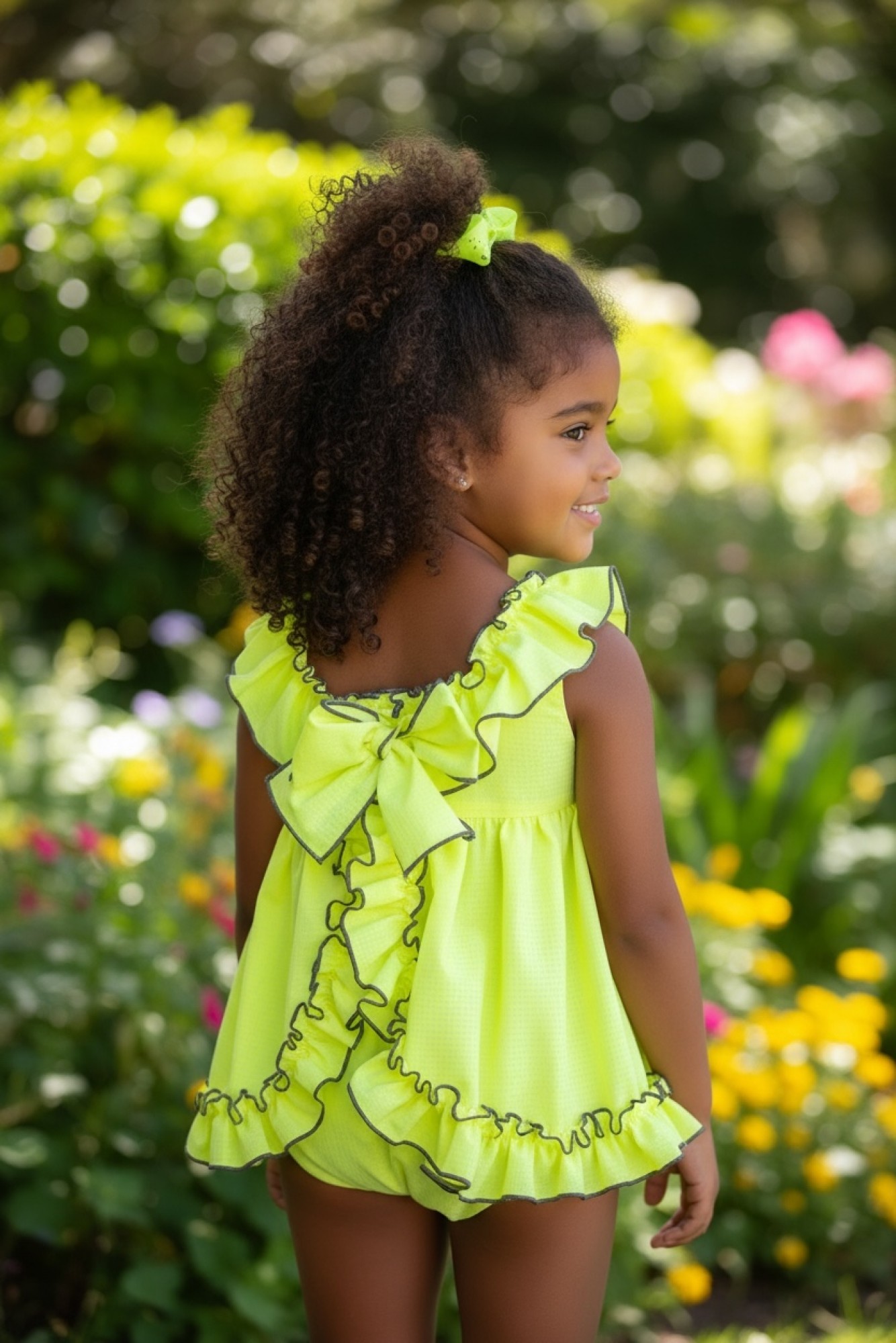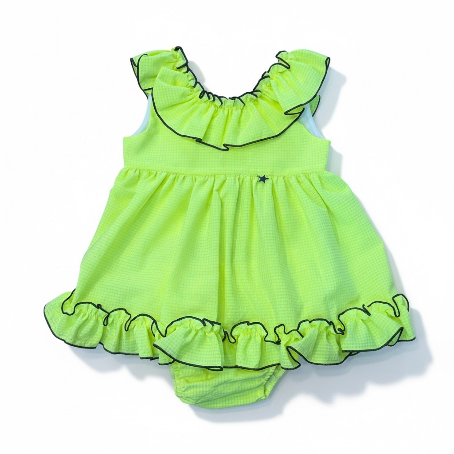 A dress with matching bloomers in vibrant lime green gingham, a super cheerful and summery set that's sure to turn heads.
