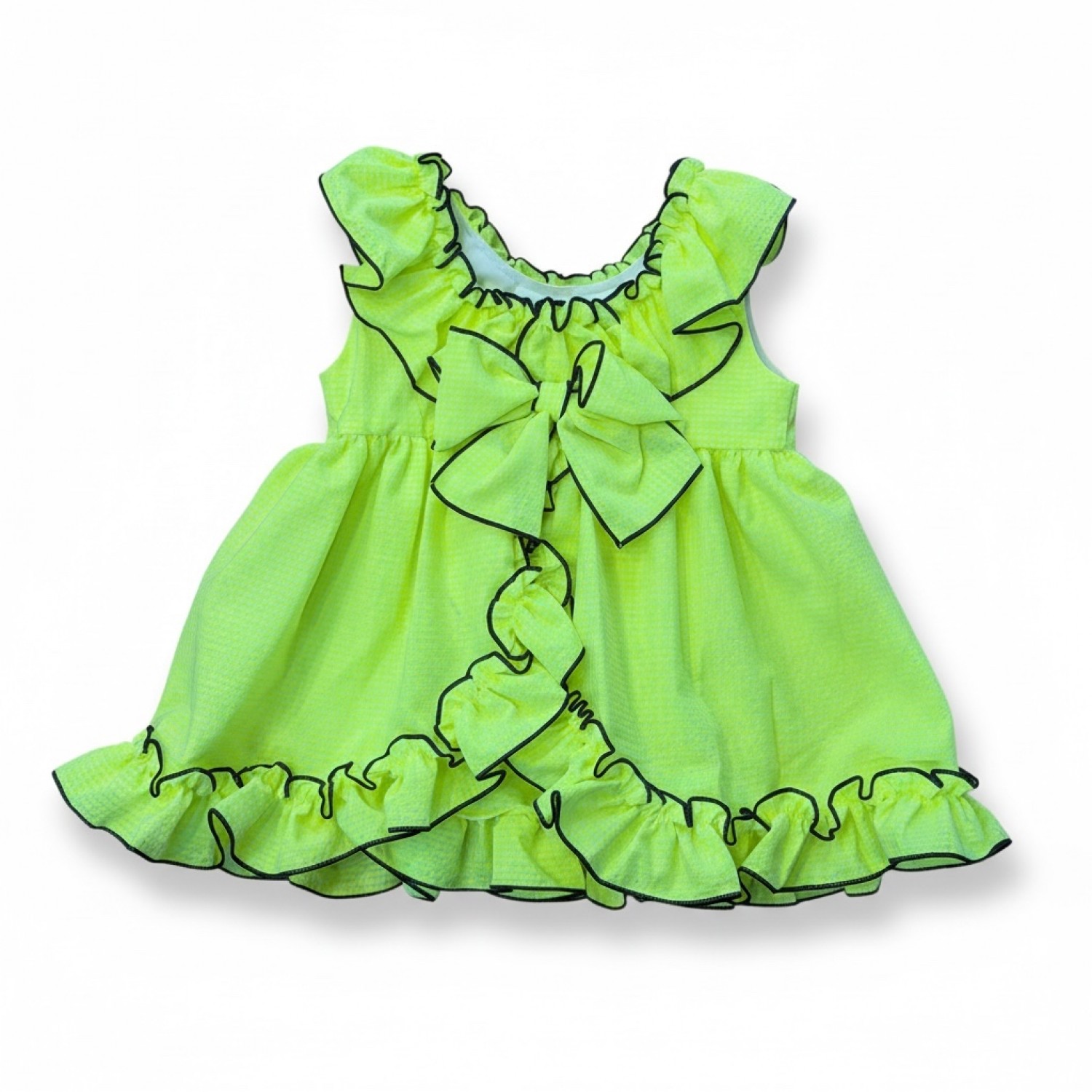 The dress features a wide ruffle at the neckline, with soft gathers and contrasting black trim that outlines the entire neckline, for a very defined and stylish finish. The flared skirt has a ruffled hem, also trimmed in black with a wavy finish, adding movement and that special touch. The back is gorgeous, with a large bow in the same fabric and a central ruffle detail, all finished with black piping to further enhance the contrast.