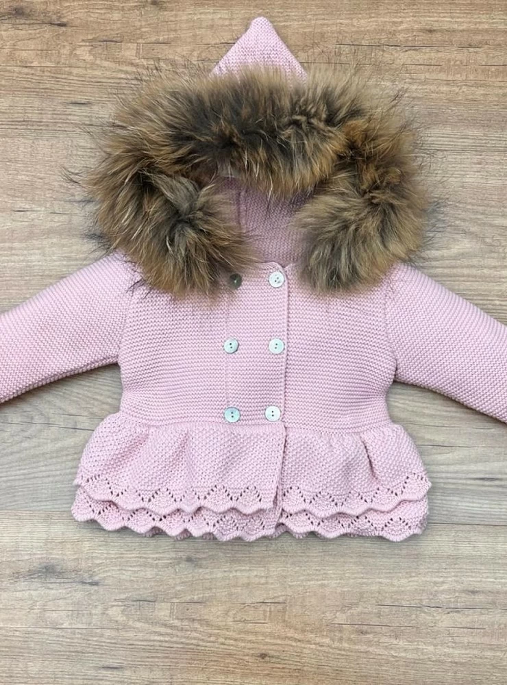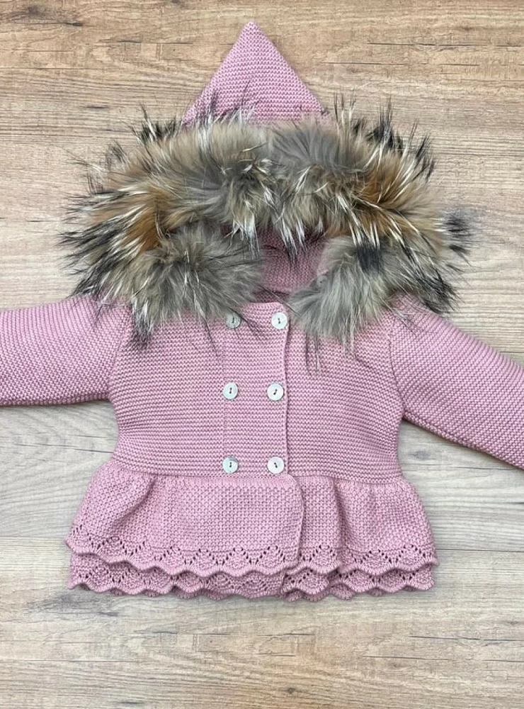 Made of 100% Dralon. (Anti-allergic wool without hair) has ruffles on the bottom and mother-of-pearl buttons Hood finished with detachable natural hair