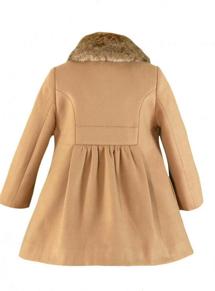It is made of washable cloth. With baby collar and fur (removable) it is crossed with 6 buttons. Plastón bag and gathers at the waist to be able to also wear with flared dresses