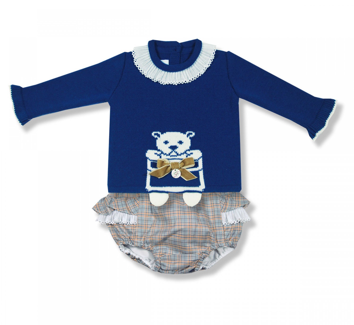·         Precioso conjunto para niña de foque.  Jersey de punto azul royal con cuello de tablas y un bonito osito blanco como detalle, lleva braguita cubre pañal de cuadros con tablitas en la parte de atrás. Tenemos capota opcional. Es monísimo