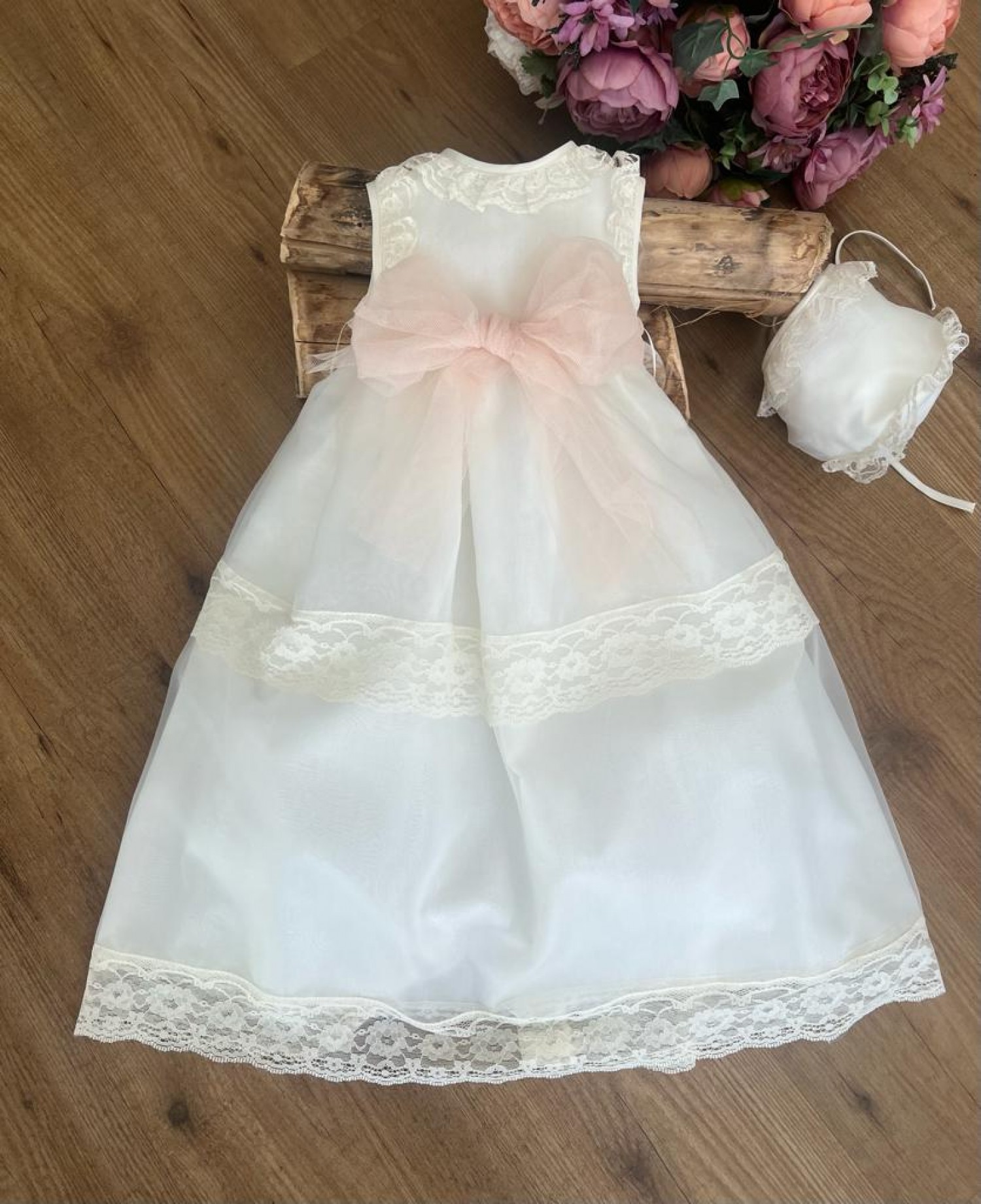 ·         Confeccionado en organza beige con puntilla en el mismo tono. Lleva lazo de tul rosa palo muy fino.