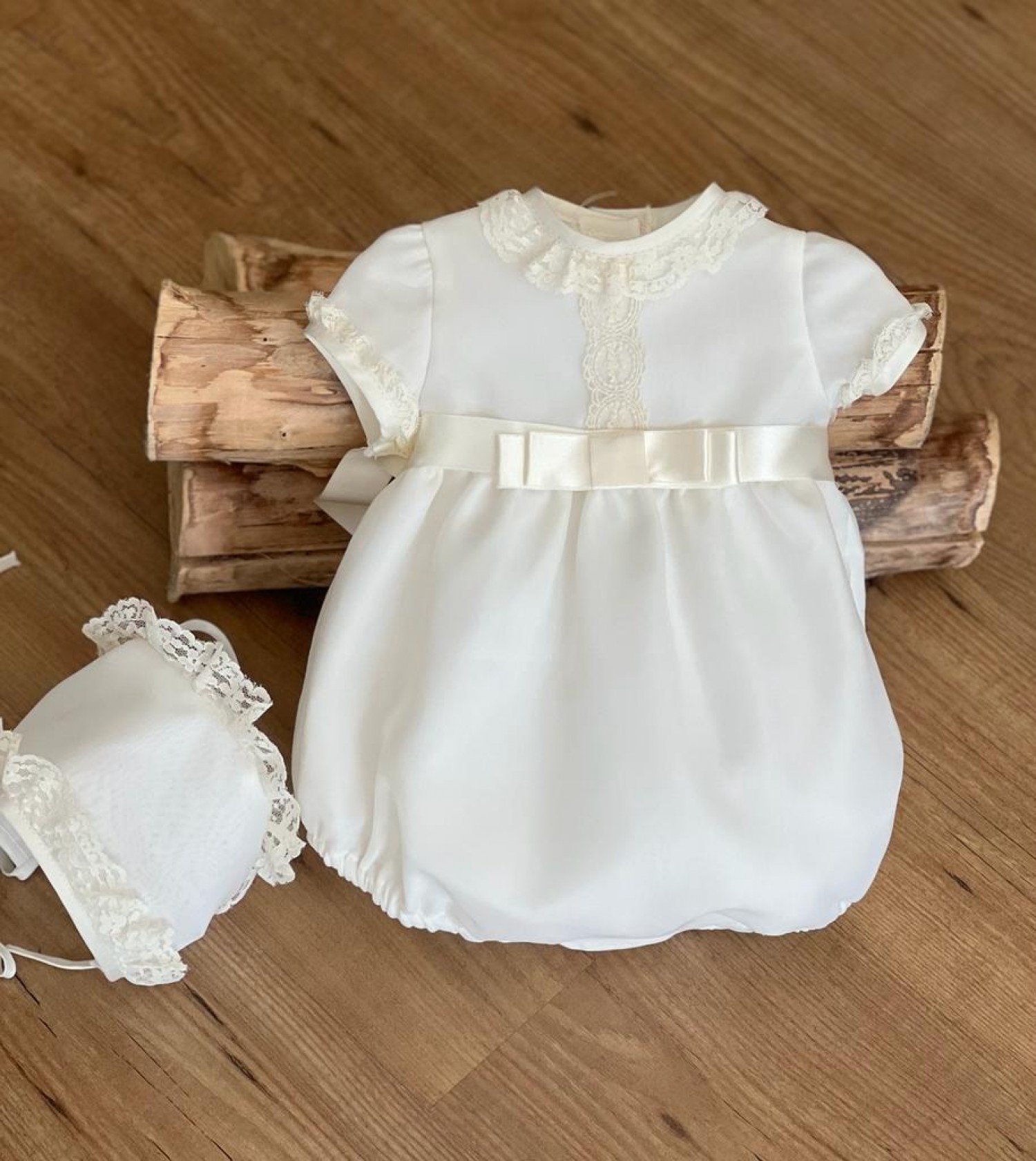 ·             Conjunto confeccionado en triple organza beige con puntilla de tul bordado y lazo plastón en el mismo tono. Es un conjunto clásico y muy elegante.