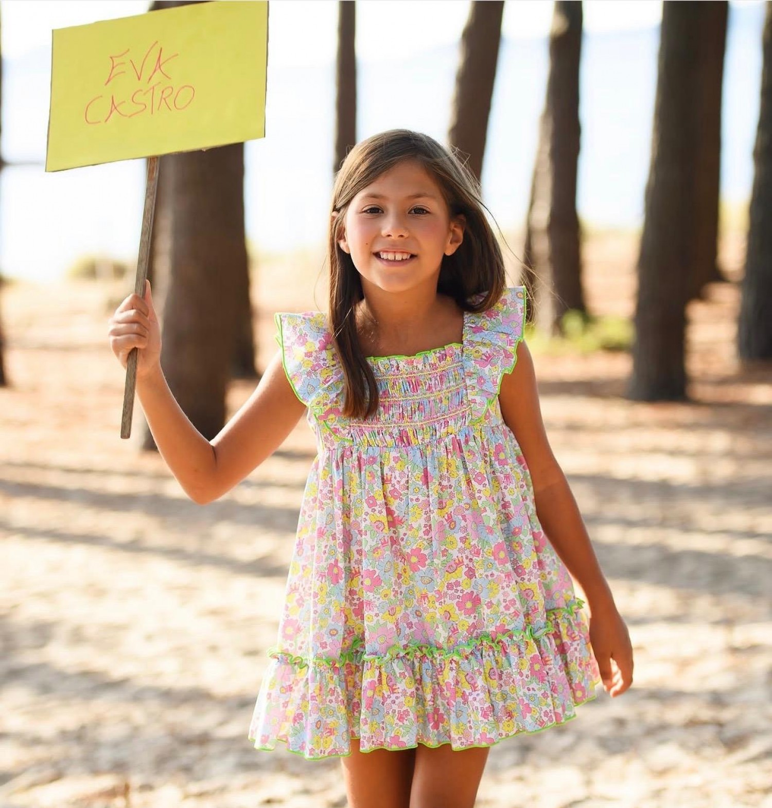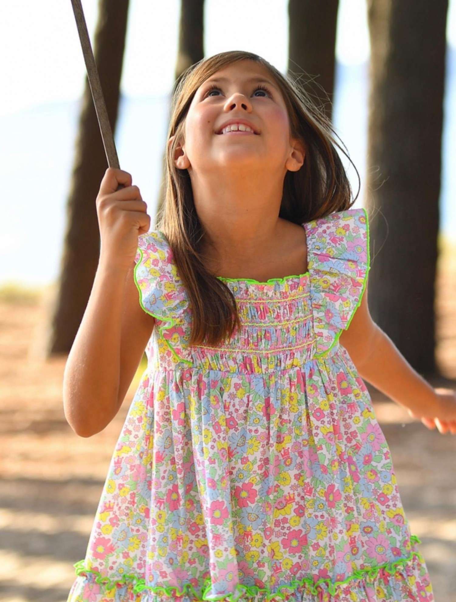 The dress is made from a printed fabric with small flowers in shades of pink, yellow, green, and blue on a light background. It features ruffled straps and a gathered bodice for added stretch and comfort. The flared skirt has a double ruffle finished with delicate green piping, adding movement and a special touch.