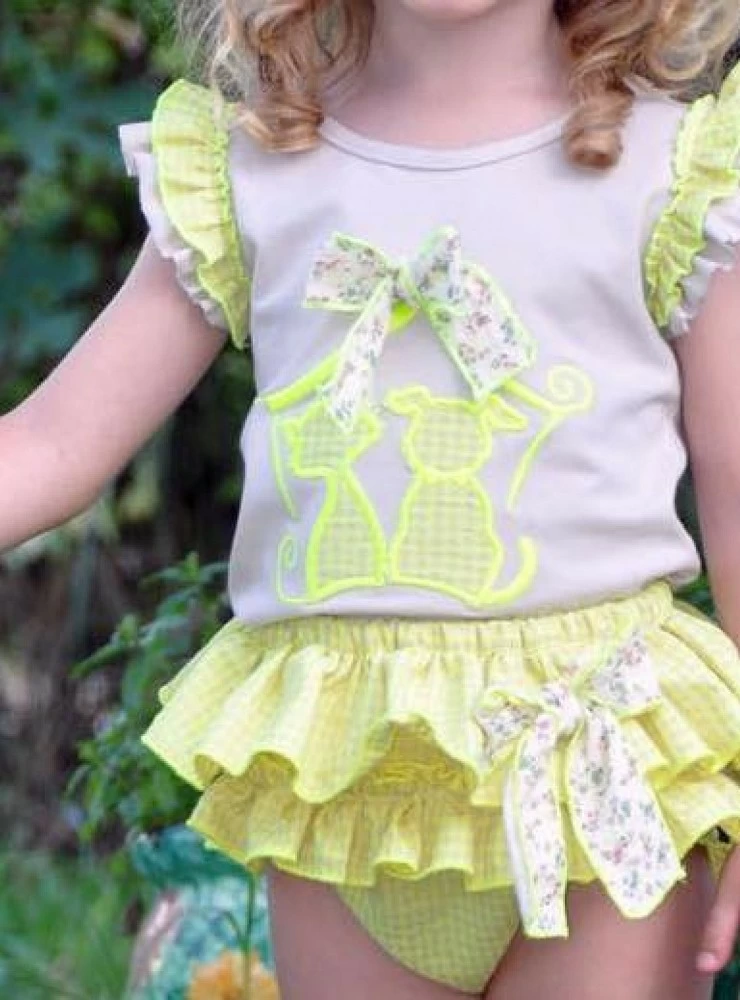 Beige cotton and lycra T-shirt with fluorine details and panties (sizes 7 and 8 wear bloomers instead of panties) in beige and fluorine squares with ruffles and flower bow.