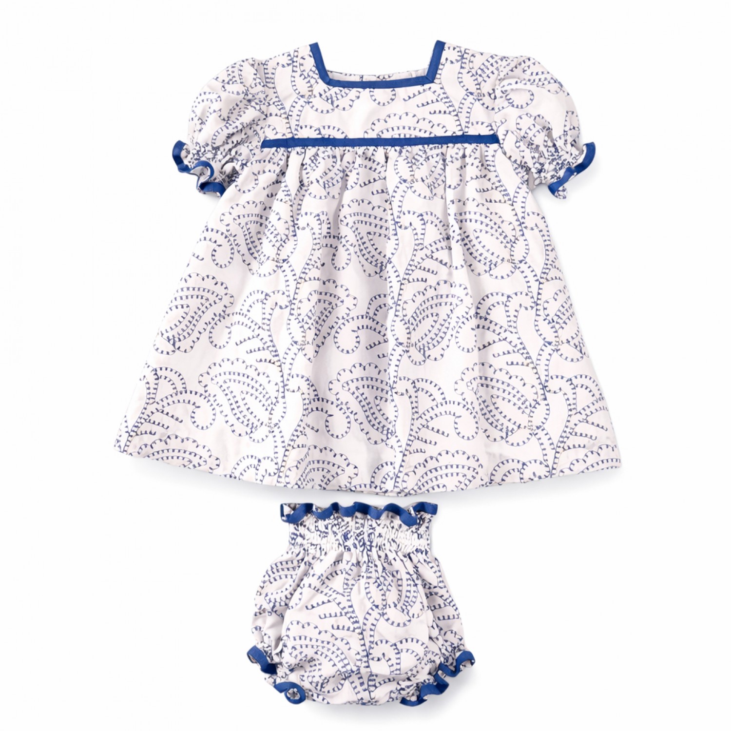 Includes matching bloomers with a gathered waistband and ruffled blue trim.