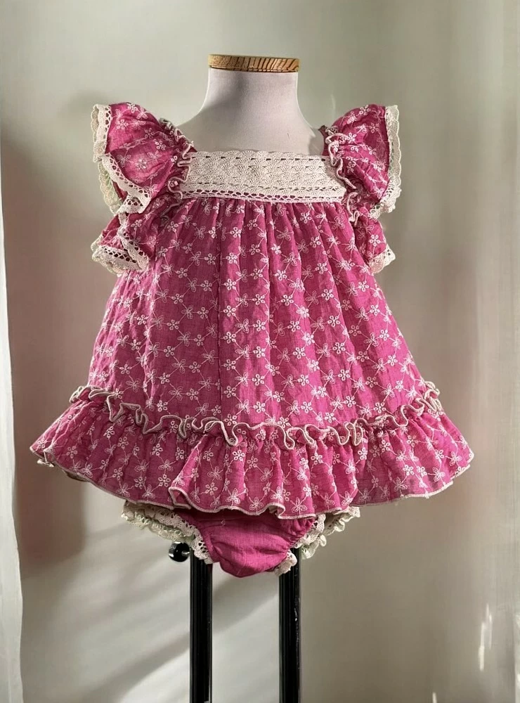 Made of fuchsia muslin embroidered in camel. It has bobbin lace as a detail on the dress and panties