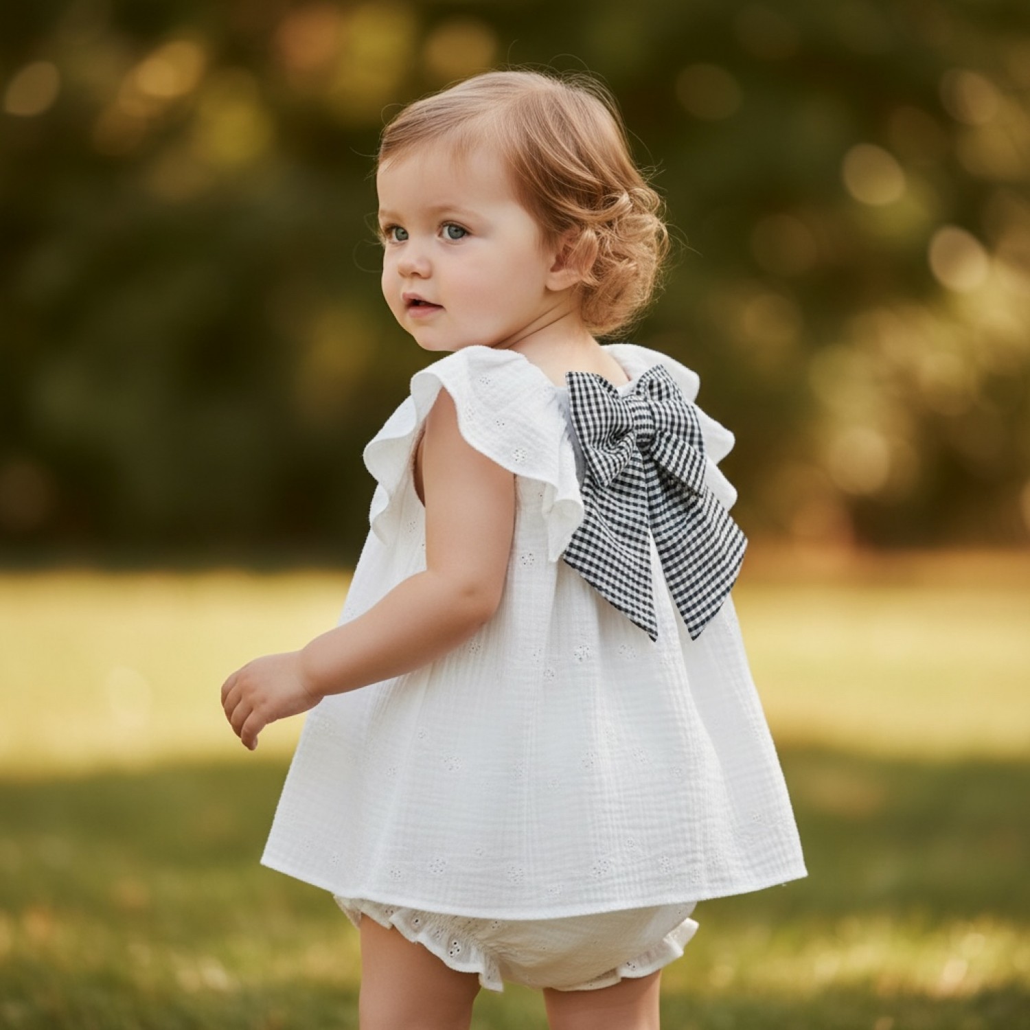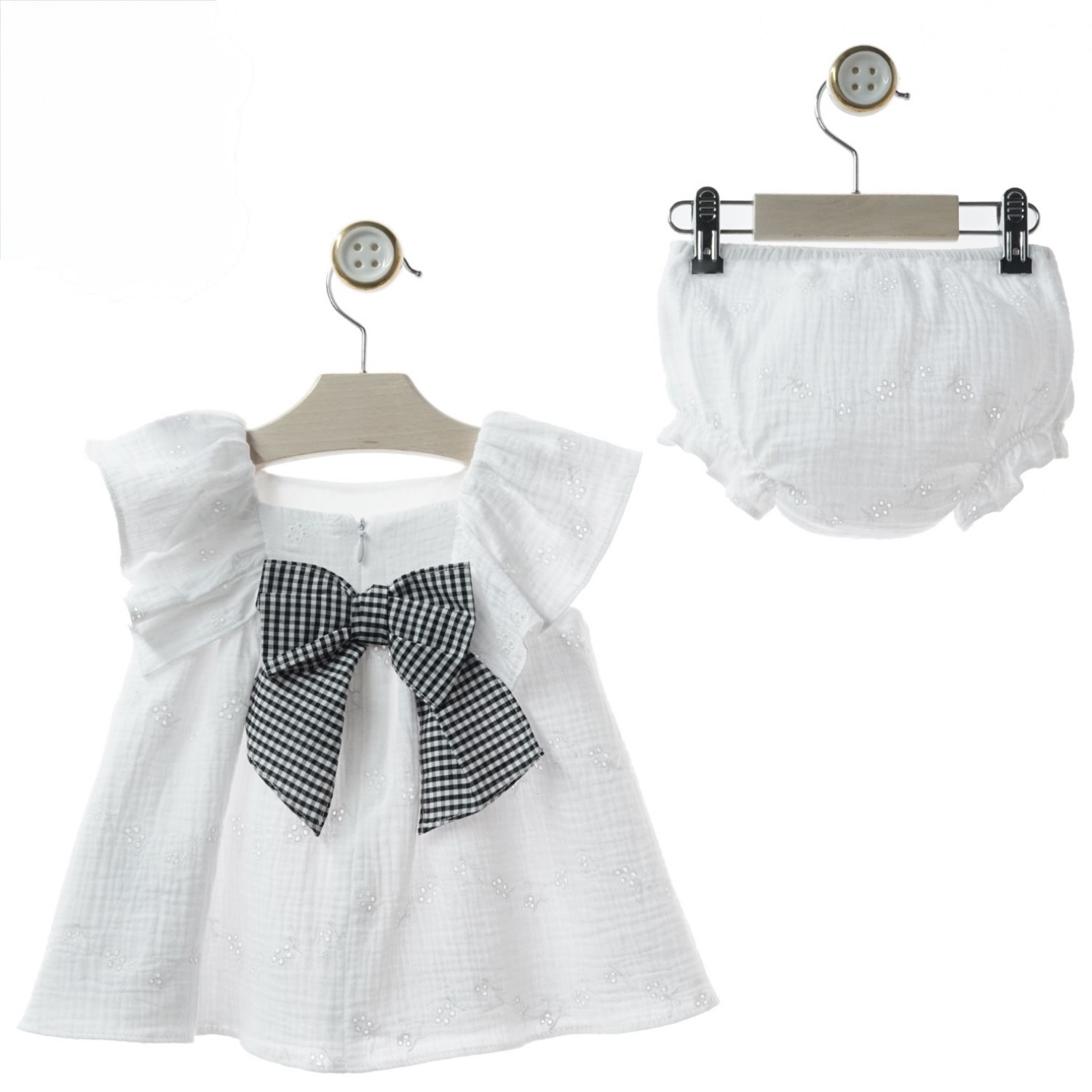 At the back, the dress is embellished with a large gingham bow that becomes the focal point of the design, providing contrast and a carefully crafted classic touch. It includes matching bloomers, designed to complete the outfit harmoniously.