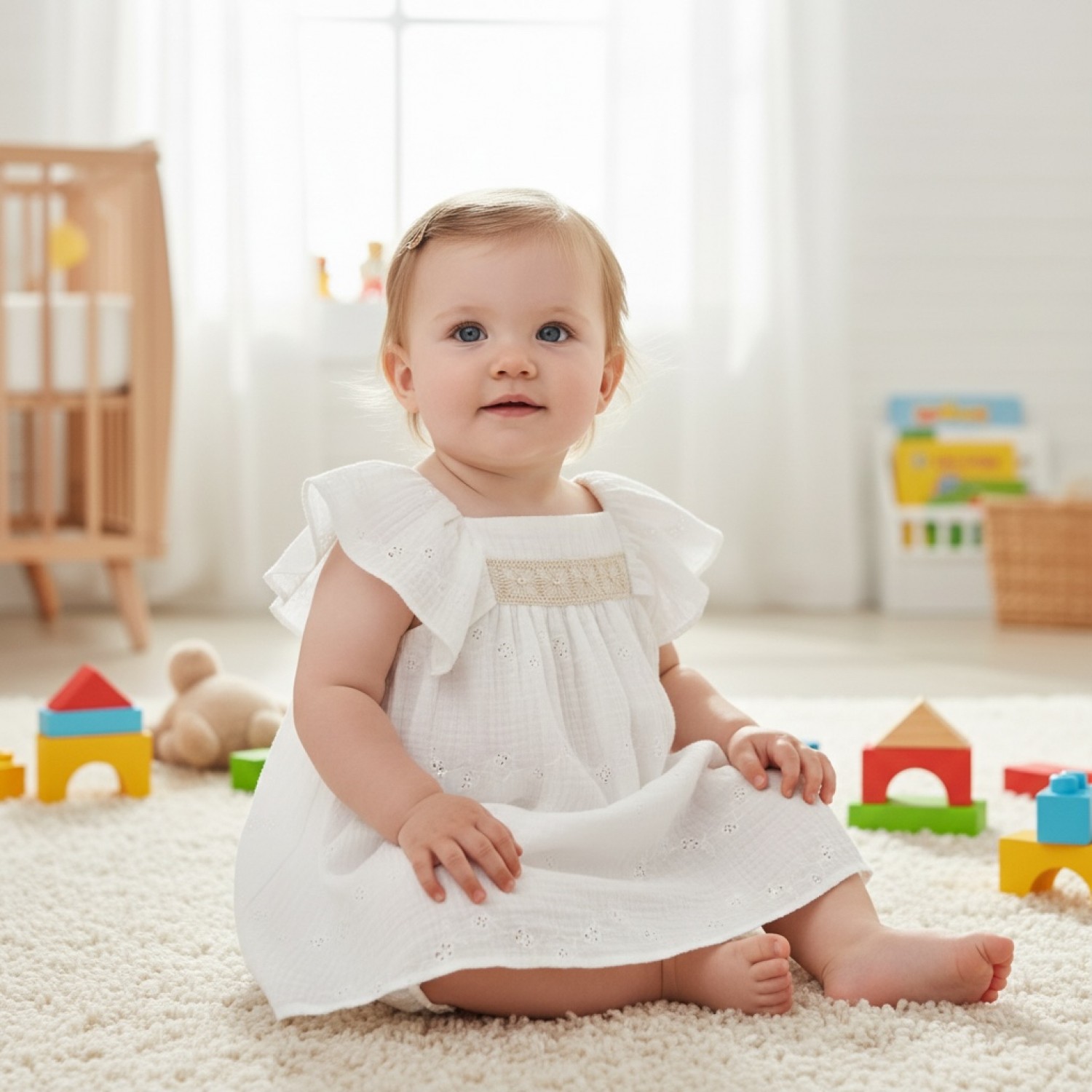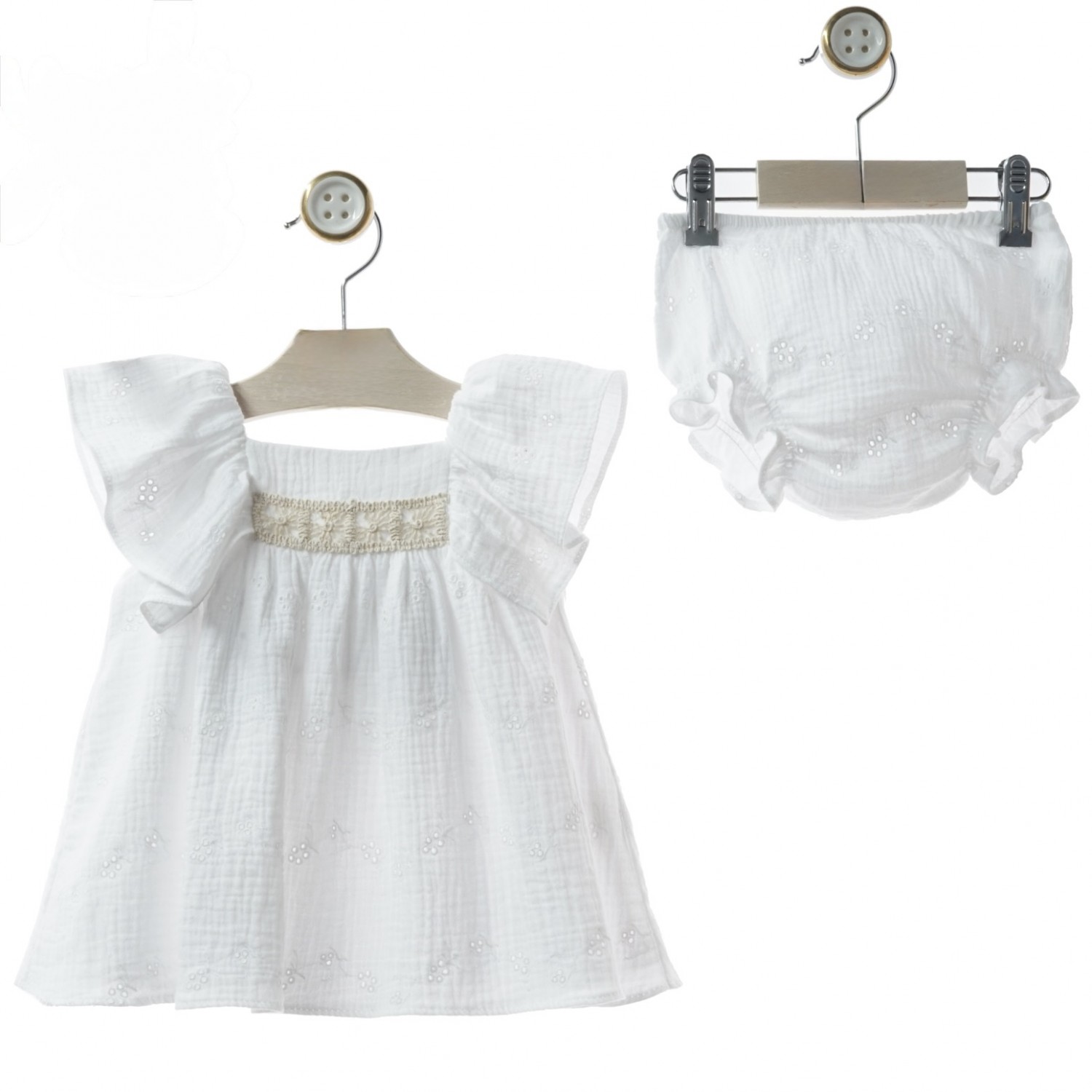 Baby dress from the Ceramics collection, made from a light and delicate muslin fabric with small openwork details that provide a cool feel and a very special finish.