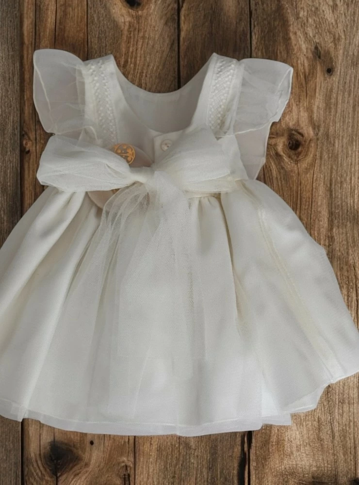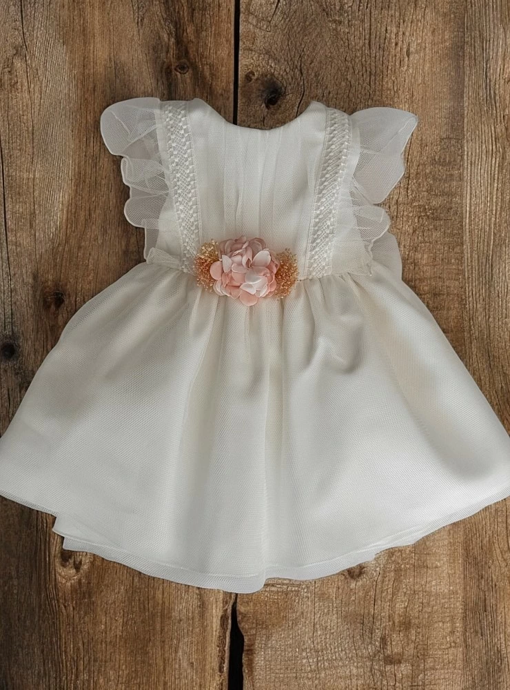 Made of beige tulle with satin interior, it has a matching thread lace, sleeveless, the back bow is also made of tulle. It has pink flowers in the center (they can be easily removed)