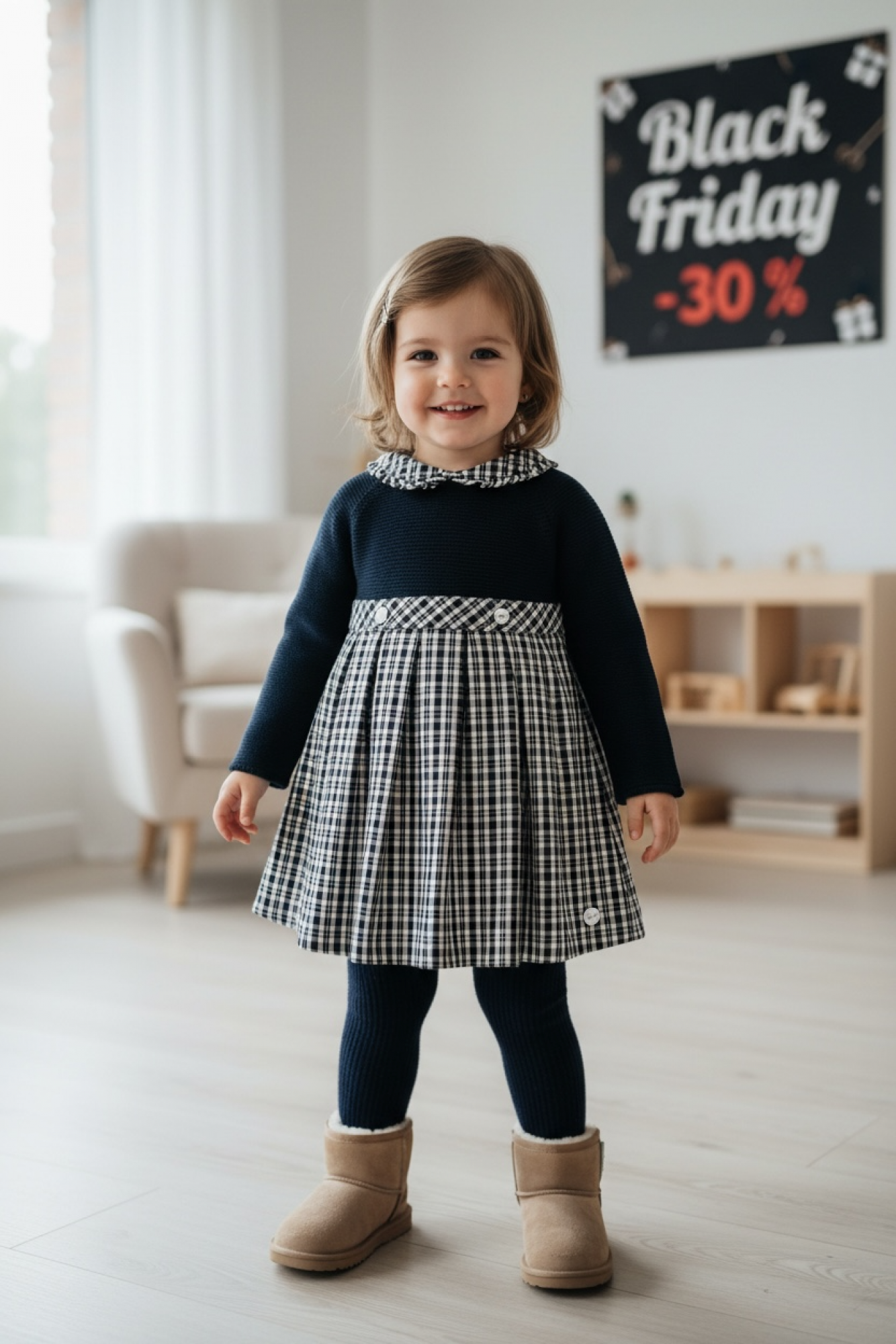 Dark green knit top with a checkered skirt in bottle green and navy. It's very pretty