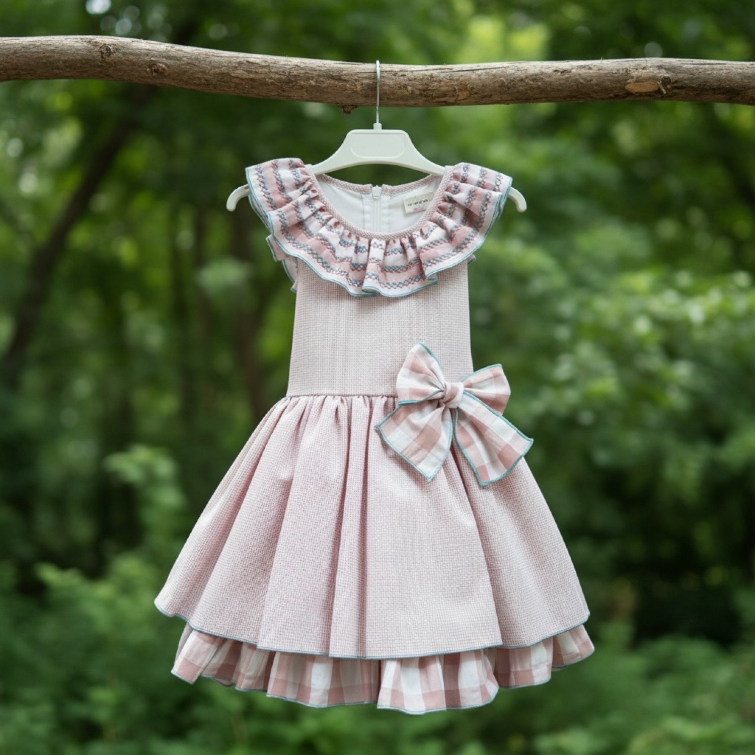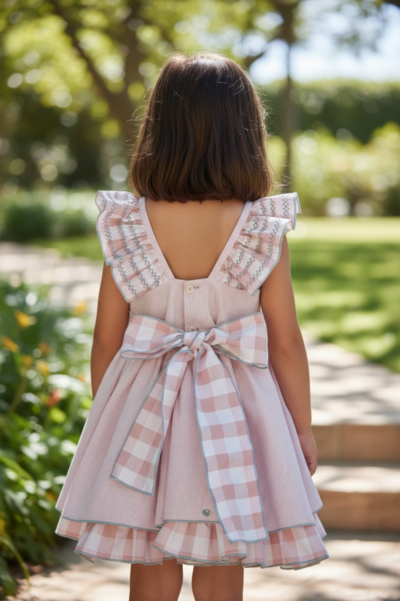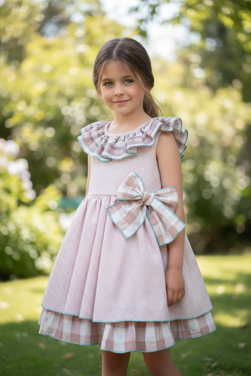 A girl's dress with a super special design in dusty rose gingham, featuring large gingham details and contrasting trims for a beautifully finished look.