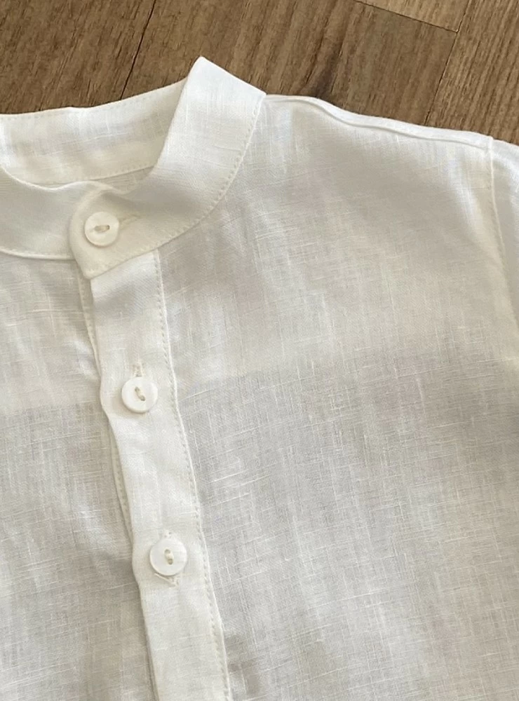 It is ideal to combine with linen pants and vest. It has long sleeves and a mandarin collar. The sleeve can be gathered up with a button and made short. Very good quality.