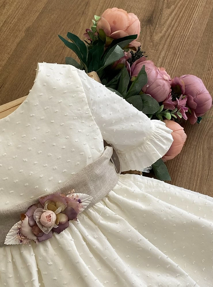 Ecru plumeti flower dress with sand linen bow.