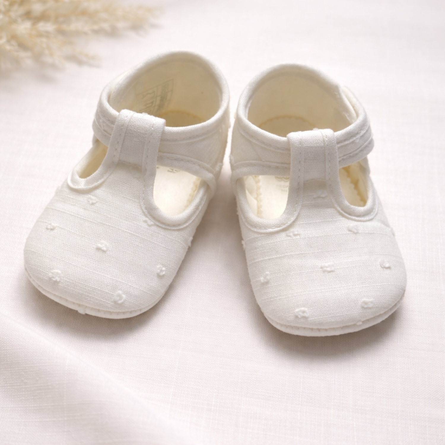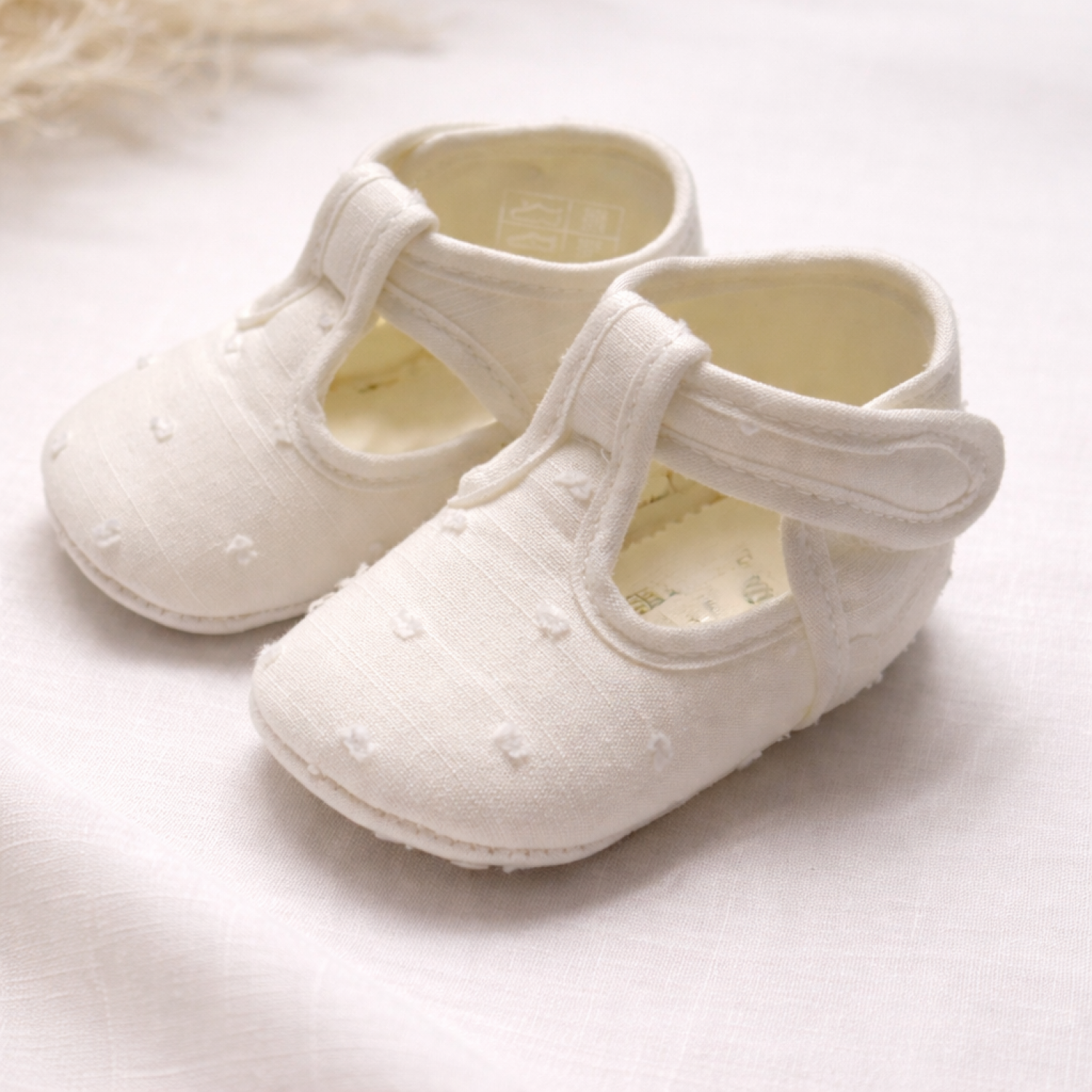 Baby boy sandal in ecru plumeti fabric, with a delicate and beautiful finish, perfect for special occasions or everyday wear. This Mary Jane style features an open toe and Velcro closure, making it comfortable and easy to put on. Ideal for completing outfits in light colors. The plumeti fabric adds texture and a special touch without being overwhelming, perfect for pairing with linen, cotton, and white or beige garments.
