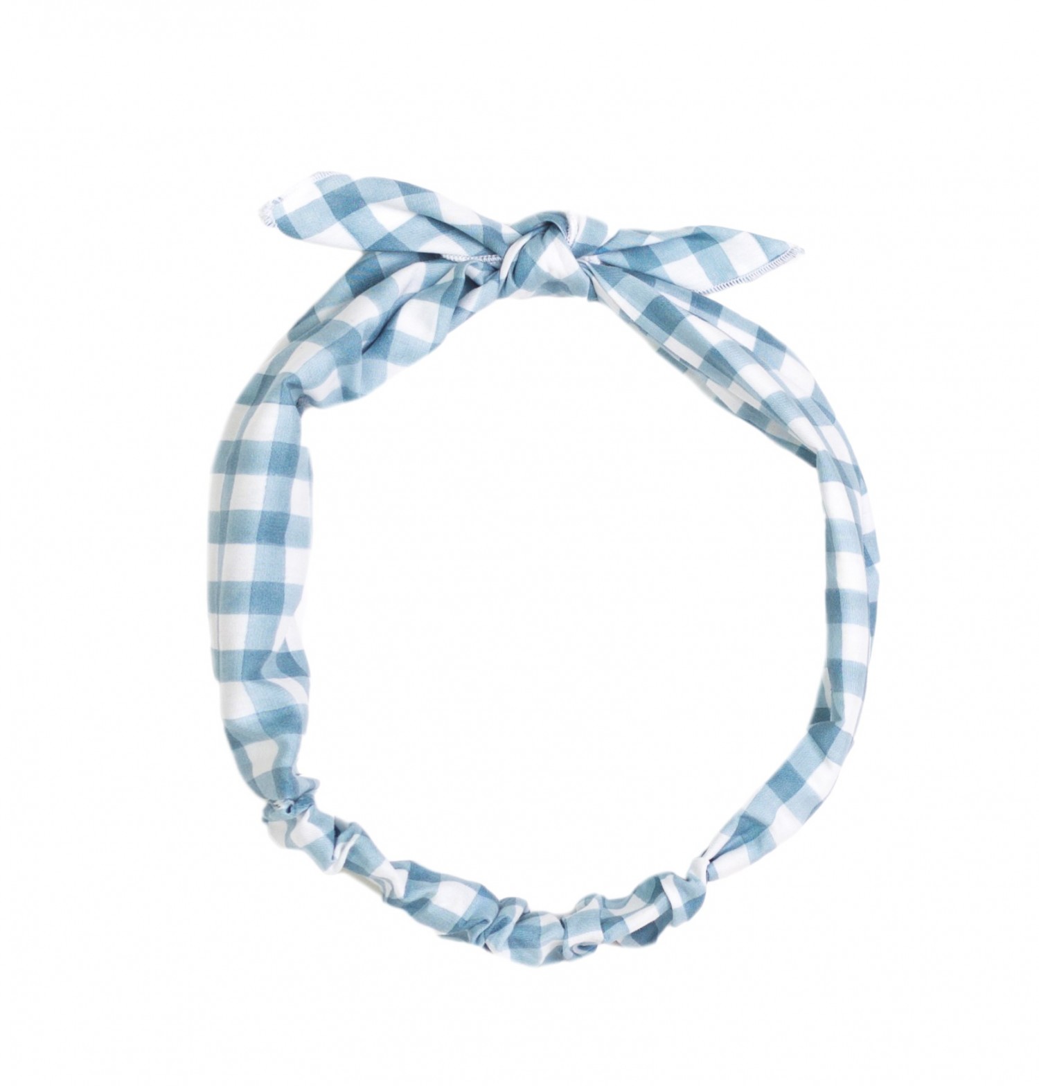 Nice turban with bow in raw and powdery blue plaid. It belongs to the Dolphin collection
