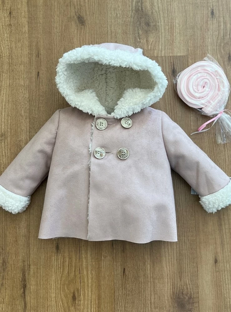 Made of suede with sheepskin interior, it has a hood. can be washed at home